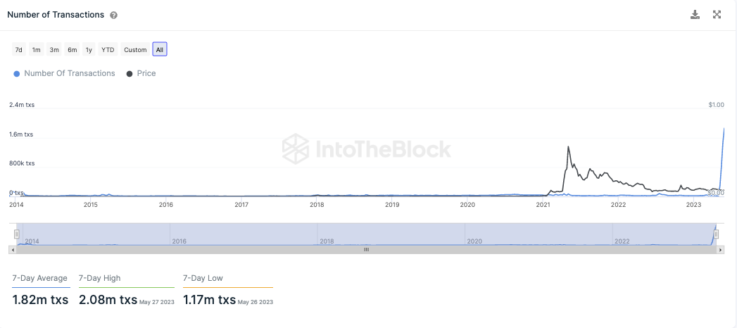 Die Anzahl an DOGE-Transaktionen geht derzeit komplett durch die Decke. Die Menge an DOGE-Transaktionen erlebte im Mai 2023 einen enormen Anstieg von 8220 %. Am 27. Mai 2023 erreichte sie mit 2,08 Millionen Transaktionen ein neues Allzeithoch. Dieser Wert ist nahezu viermal höher als der Spitzenwert von 576.000 Transaktionen, den das Bitcoin-Netzwerk Mitte Mai 2023 verzeichnete. Was dahinter steckt, erfährst du hier.