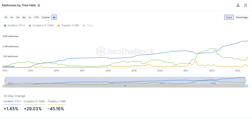 Die Menge an Dogecoin-Adressen, die DOGE länger als ein Jahr unberührt lassen, verzeichnet einen deutlichen Anstieg. In den vergangenen 30 Tagen ist diese Gruppe um 1,45 % gewachsen. Im Gegensatz dazu hat die Anzahl der Adressen, die DOGE weniger als einen Monat halten, in den letzten 30 Tagen um etwa 45 % abgenommen.