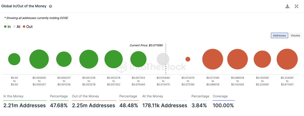 Rund 48,48 % der DOGE-Adressen würden einen Verlust erleiden, wenn sie DOGE zum aktuellen Marktpreis verkaufen. Hingegen verzeichnen nur rund 47,68 % einen Gewinn, wenn sie jetzt verkaufen. Demnach ist die Mehrheit der DOGE-Adressen bereits in der Verlustzone angekommen.