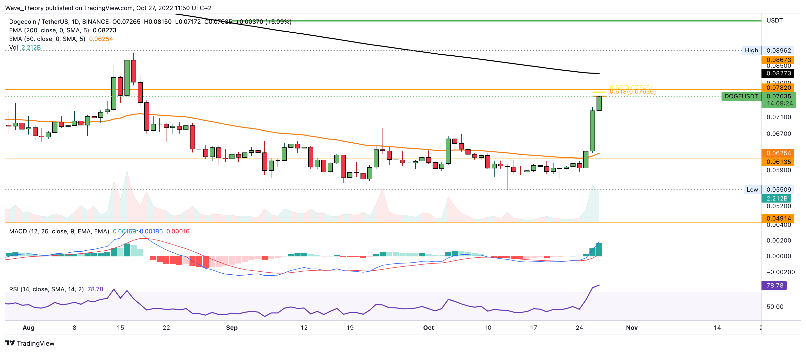 Kurzfristig könnte der Dogecoin Kurs auf rund 0,0714 USD oder gar 0,065 USD korrigieren, wo der Dogecoin Kurs auf signifikante Fibonacci Unterstützungen stößt.