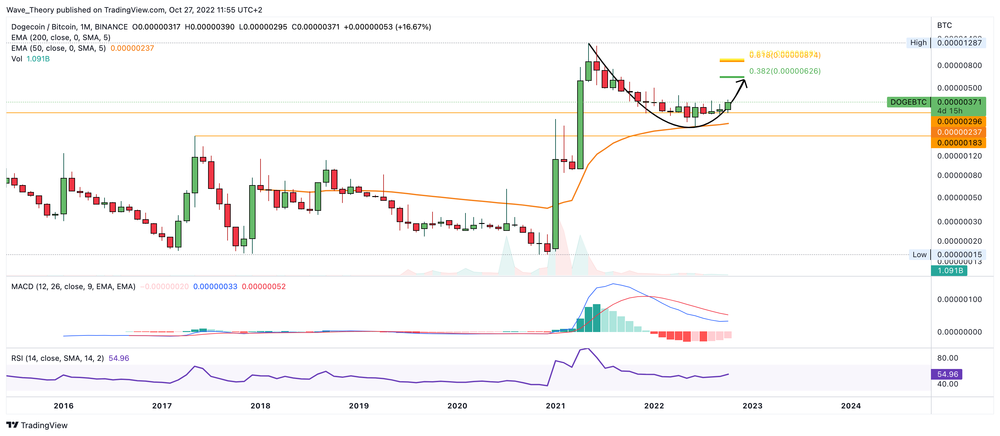Gegen BTC tickt das Histogramm des MACDs den dritten Monat in Folge bullisch höher. Zudem konnte der Dogecoin Kurs perfekt am 50-Monate-EMA bei rund 0,00000237 BTC abprallen, um die folgenden Monate eine leichte Aufwärtsbewegung zu initiieren. Doch in diesem Monat scheint DOGE den Preisbereich der letzten zehn Monate verlassen zu können.