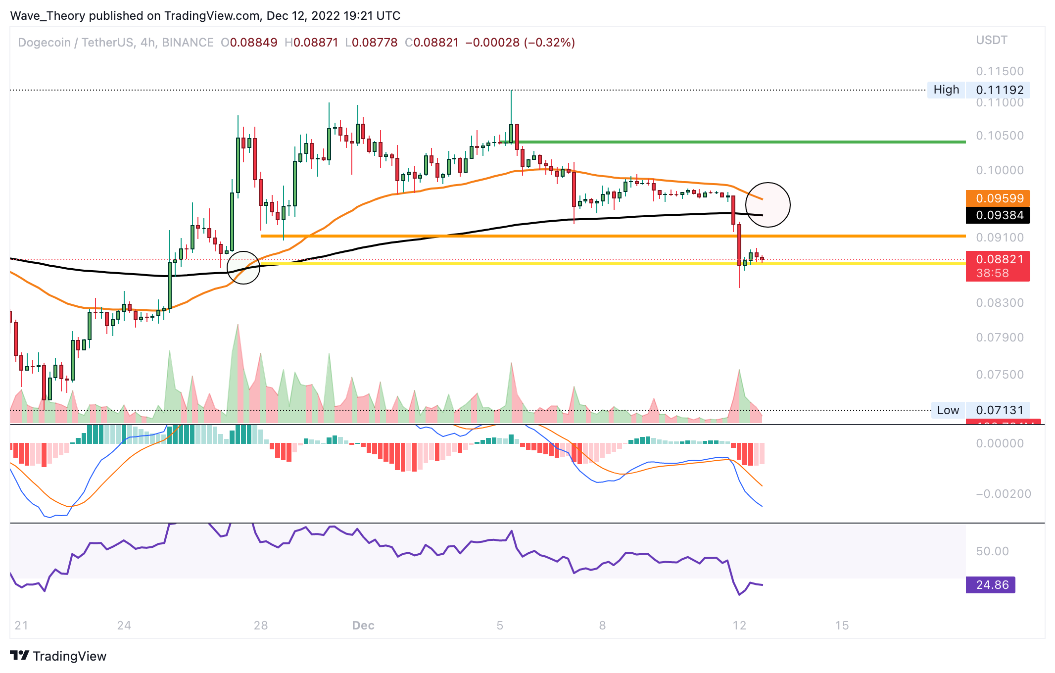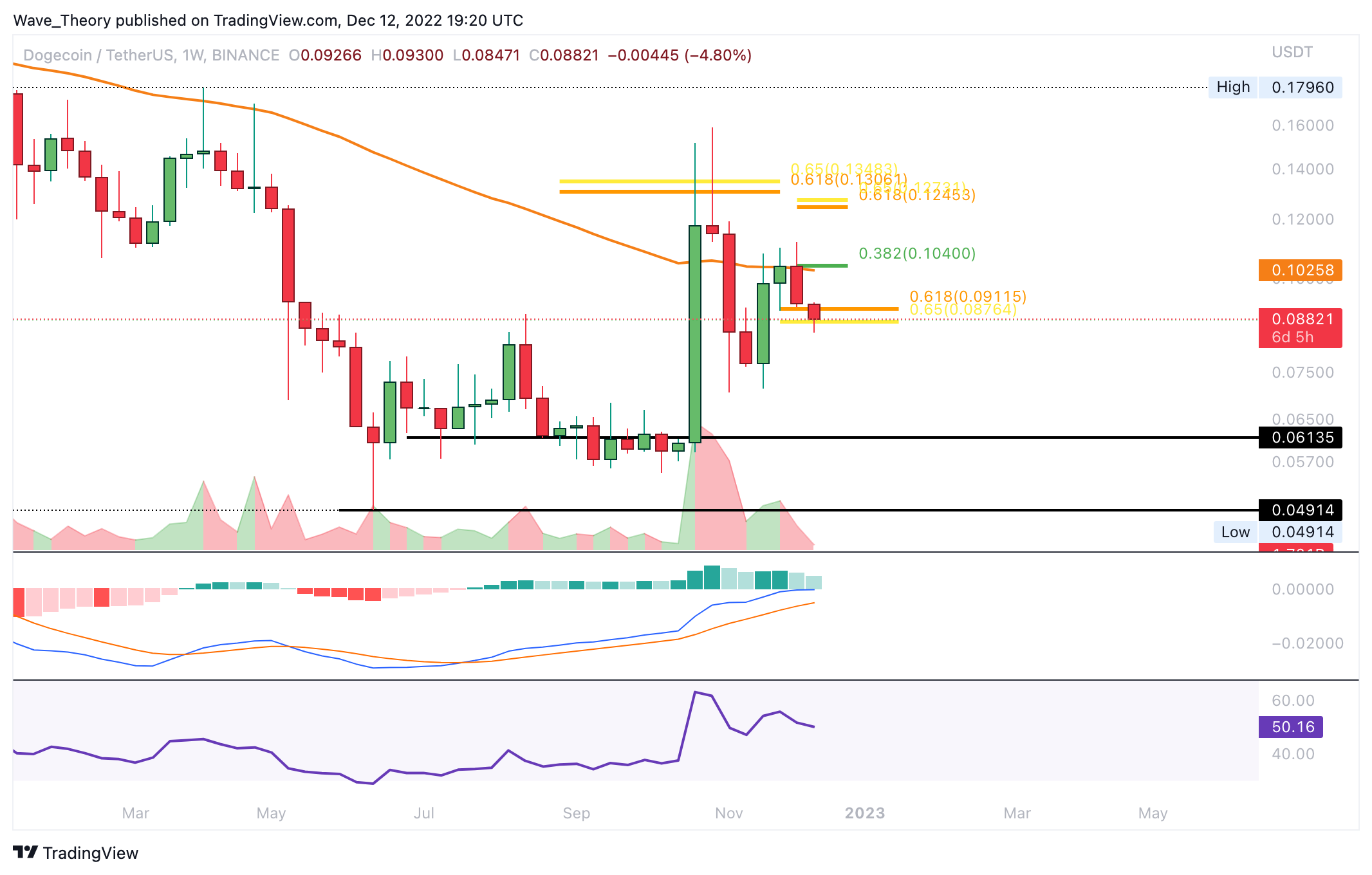 Der Dogecoin Kurs wurde am 50-Wochen-EMA bärisch abgewiesen und befindet sich damit an der Golden Ratio Unterstützung. Wird diese bärisch gebrochen werden?