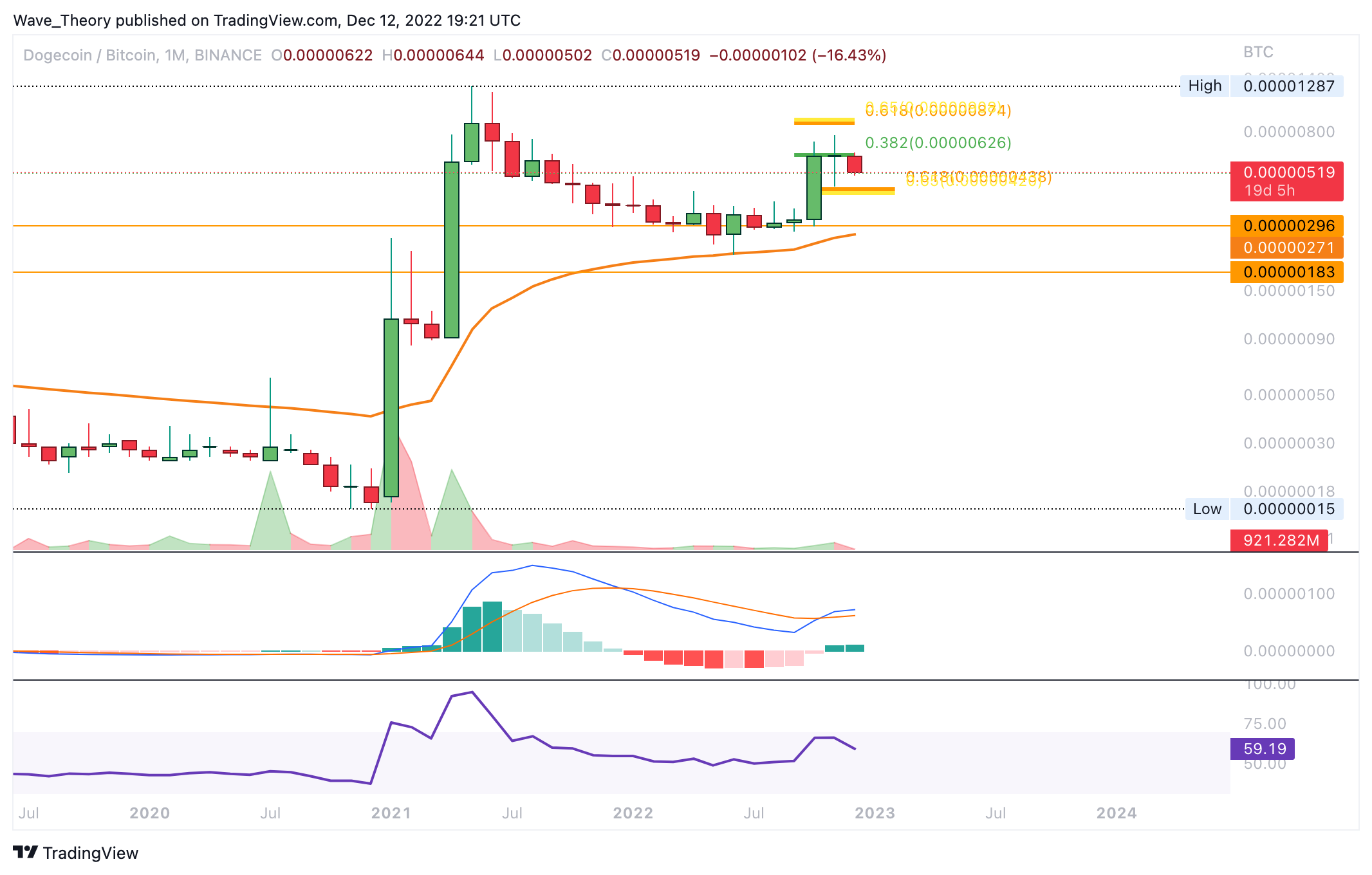 Bricht Dogecoin die Golden Ratio Unterstützung bärisch, wartet erst wieder zwischen 0,00000183 BTC und 0,000003 BTC signifikante Unterstützung auf den DOGE Kurs.