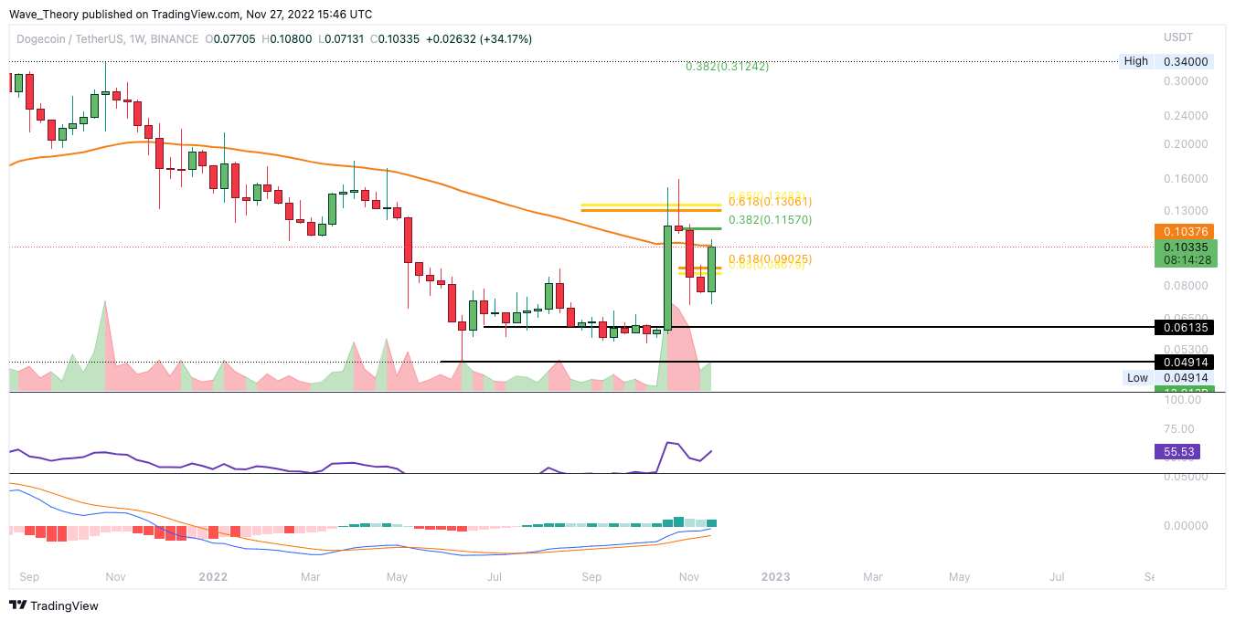 In der letzten Dogecoin Kurs Prognose, welche bereits drei Wochen zurückliegt, schrieben wir: “Der Dogecoin Kurs erreichte die Golden Ratio bei rund 0,13 USD, woran Dogecoin kurzfristig auf bärische Ablehnung stieß. Anschließend korrigierte der DOGE Kurs zur 0,382 Fib Unterstützung bei rund 0,115 USD, woran Dogecoin abzuprallen scheint.