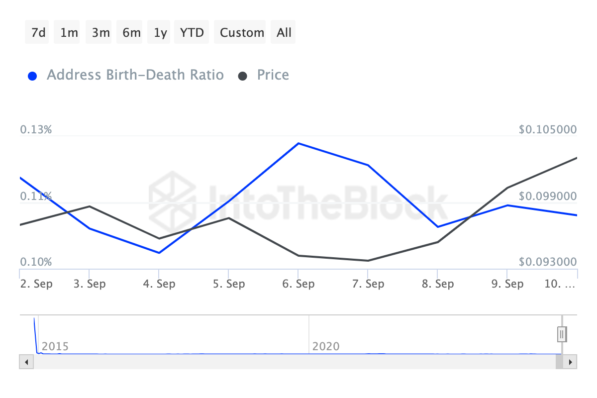 Ein hohes Verhältnis von Adress-Neuerstellung zu -Löschung zeigt, dass eine Kryptowährung mehr Adoption als Austritte sieht. Derzeit liegt das Verhältnis jedoch bei 0,11 Prozent, was darauf hindeutet, dass mehr DOGE-Wallets stillgelegt als neu erstellt werden.