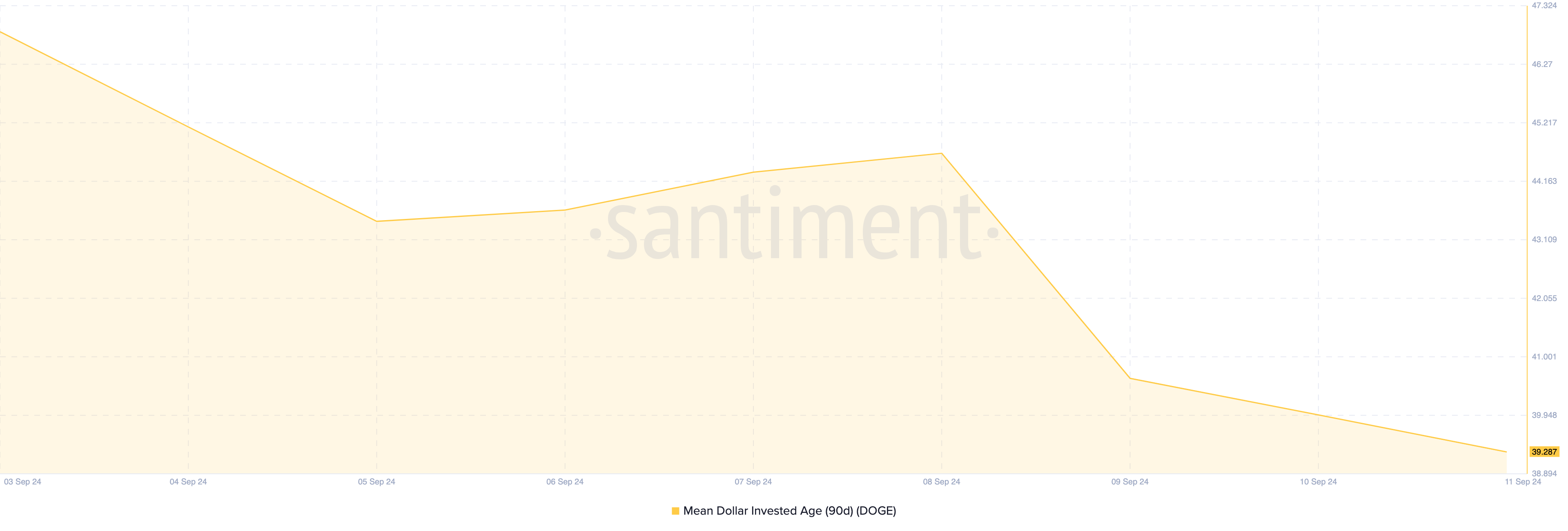 Das Mean Dollar Invested Age (MDIA) von Dogecoin ist die erste wichtige Kennzahl, die es zu beachten gilt. Der MDIA misst das durchschnittliche Alter jedes in den Coin investierten USD. Ein steigender MDIA zeigt an, dass die Coins langfristig gehalten werden, was bedeutet, dass die Besitzer nicht verkaufen. Ein fallender MDIA zeigt an, dass mehr Teilnehmer ihre Coins handeln, was oft auf große Verkäufe hinweist.