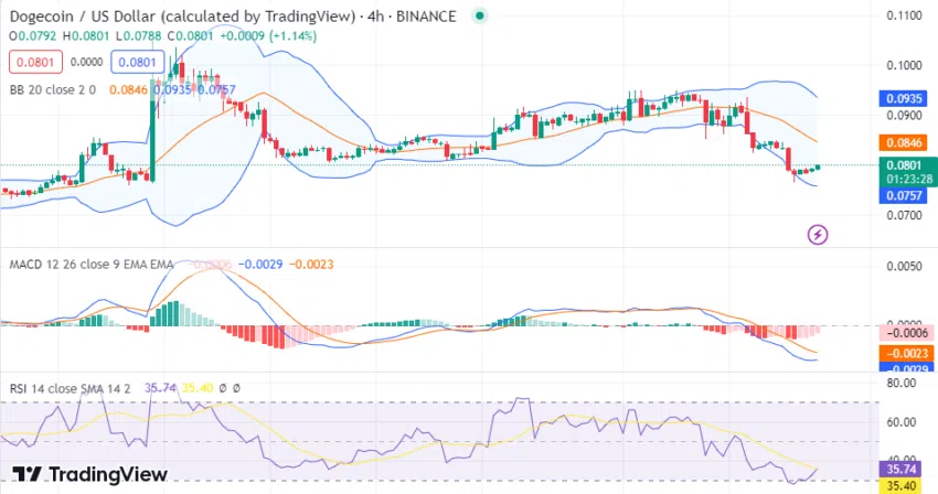 Einige Signale deuten auf einen zunehmenden Verkaufsdruck von Dogecoin hin. Aktuell konsolidiert DOGE Kurs bei 0,07735 USD, während die Bären die Kontrolle zu behalten scheinen.