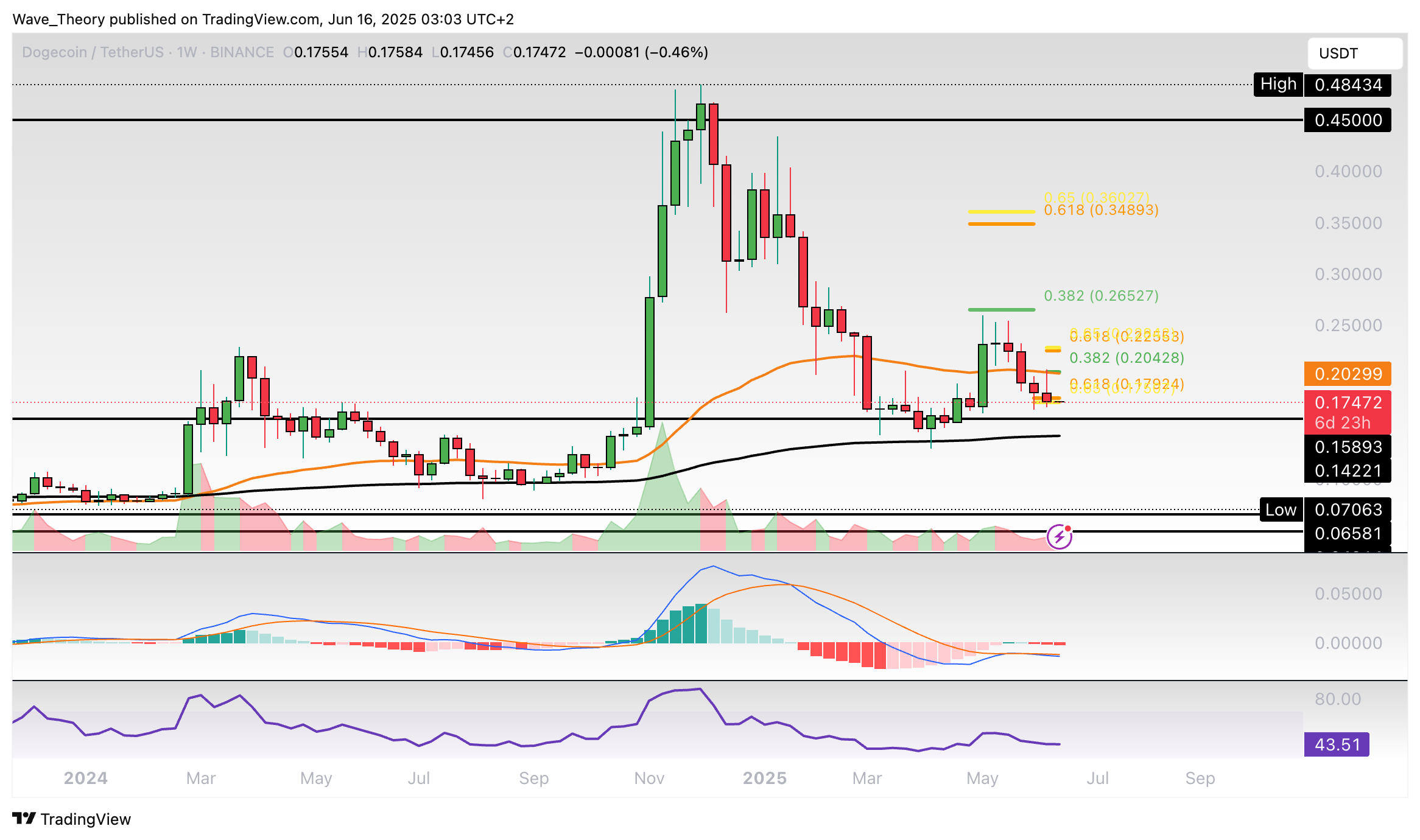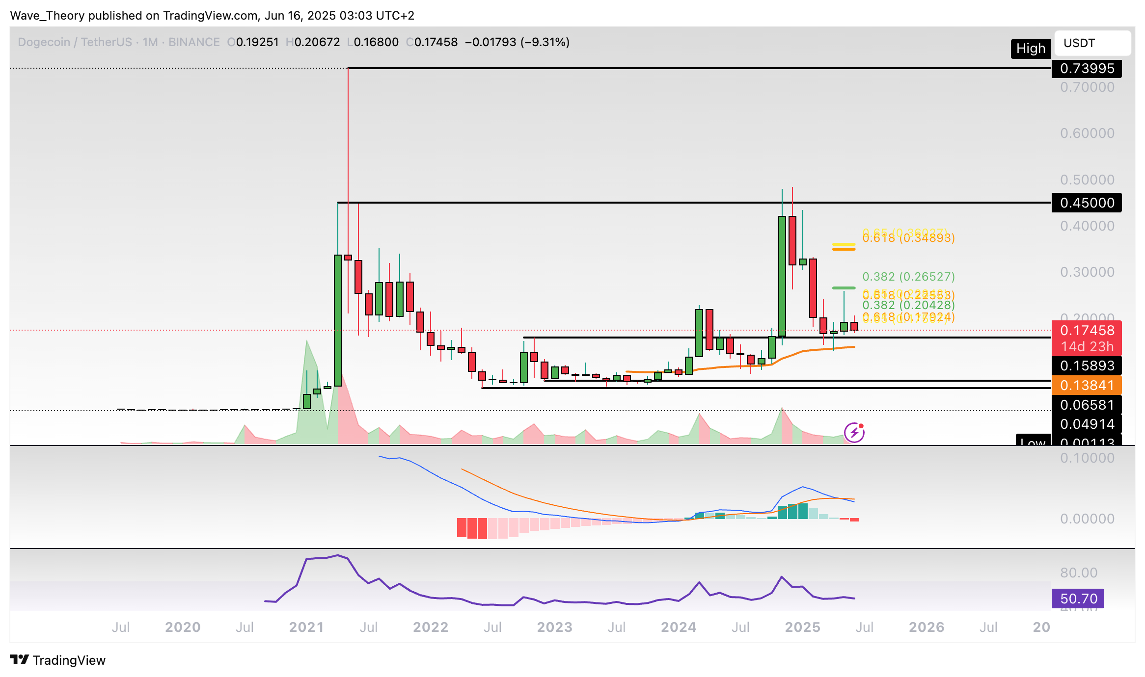 Im Monatschart wird deutlich, dass der Dogecoin Kurs letzten Monat am 0,382 Fib Widerstand bei rund 0,265 USD bärisch abgewiesen wurde. Damit könnte Dogecoin mittelfristig zum 50-Monate-EMA bei rund 0,138 USD zurückkehren.