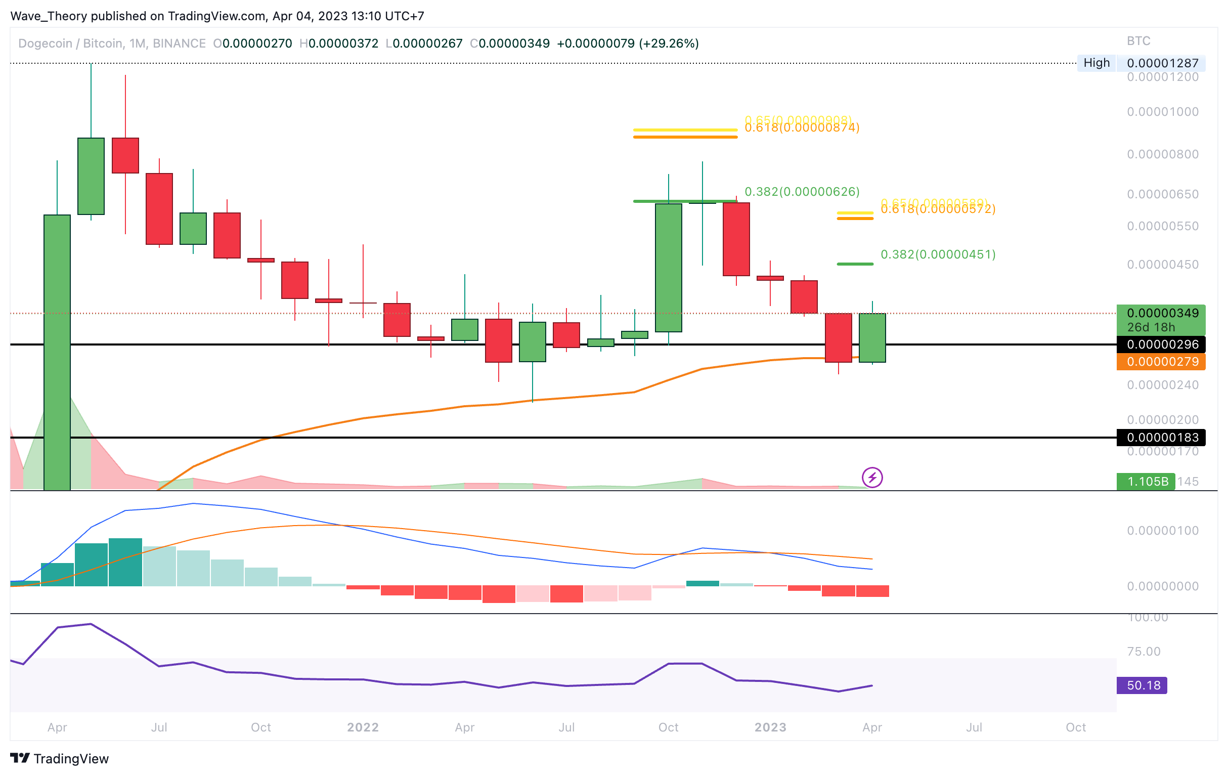 Auch gegen BTC gibt der Dogecoin Kurs sehr bullische Signale. So konnte Dogecoin letzten Monat an der 50-Monate-EMA Unterstützung bei rund 0,0000028 BTC abprallen. Zudem könnte Dogecoin in diesem Monat eine “Bullish-Engulfing-Candle” formen, woraufhin Dogecoin in den kommenden Wochen die Fib Widerstände bei rund 0,0000045 BTC und rund 0,000006 BTC ins Visier nehmen könnte.