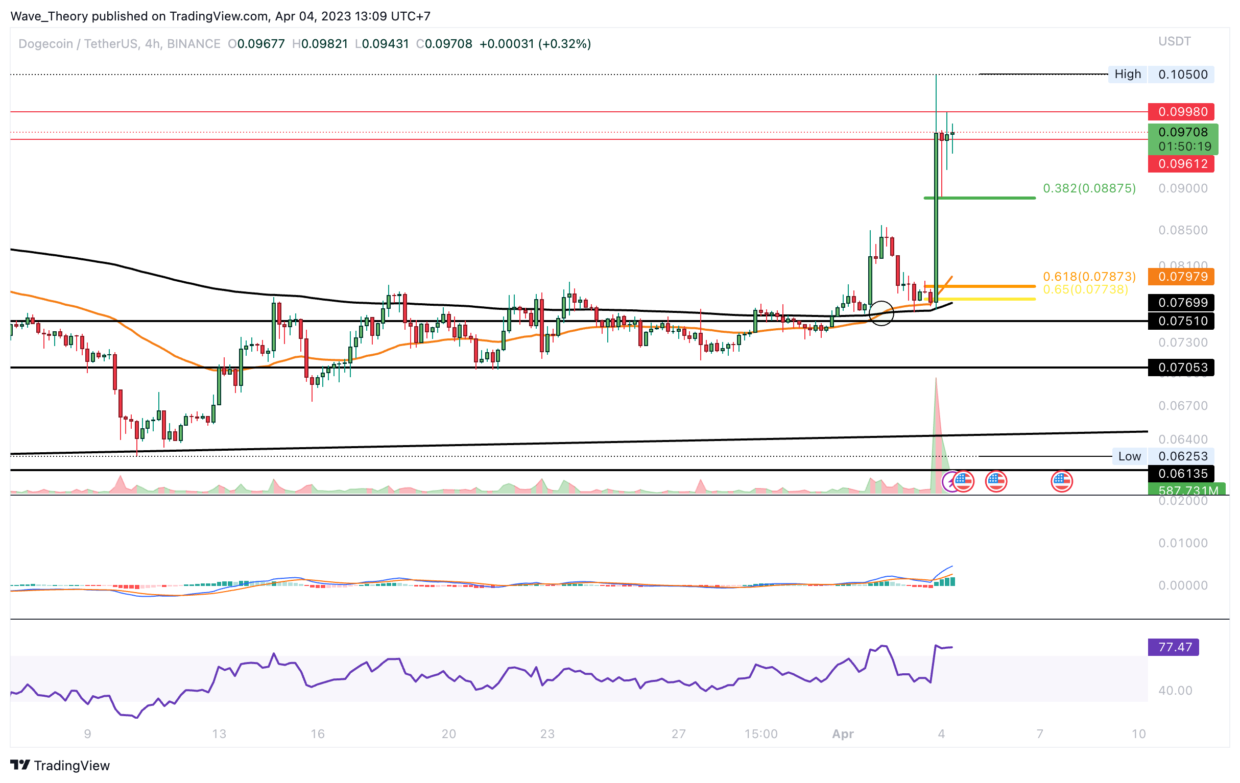 Im 4h-Chart formte sich bereits ein Golden Crossover, womit der Trend kurzfristig bereits bullisch bestätigt ist. Zudem tickt das Histogramm des MACDs bullisch höher und die MACD Linien sind bullisch überkreuzt. Der RSI befindet sich derweilen in stark überkauften Regionen und grenzt an einer bärischen Divergenz. Sollte Dogecoin jetzt korrigieren, warten bereits bei rund 0,08875 USD und bei rund 0,078 USD die nächsten signifikanten Fib Unterstützungen.