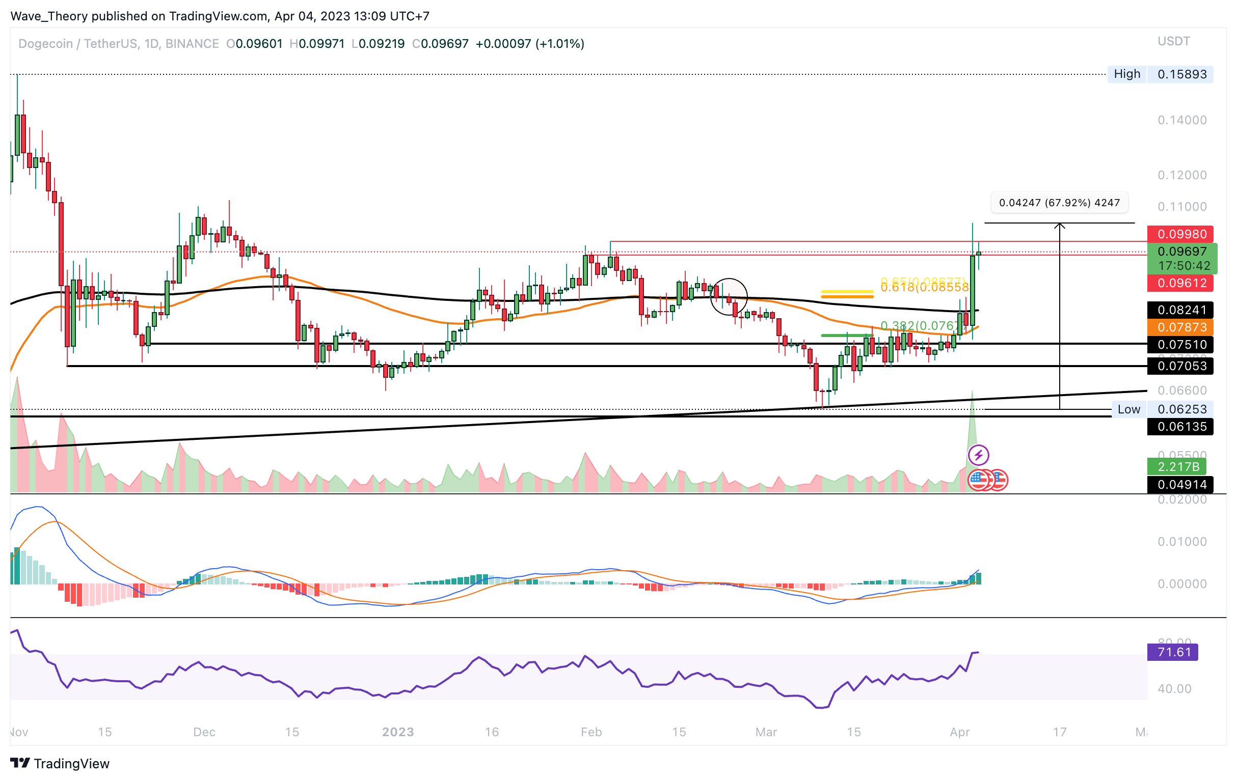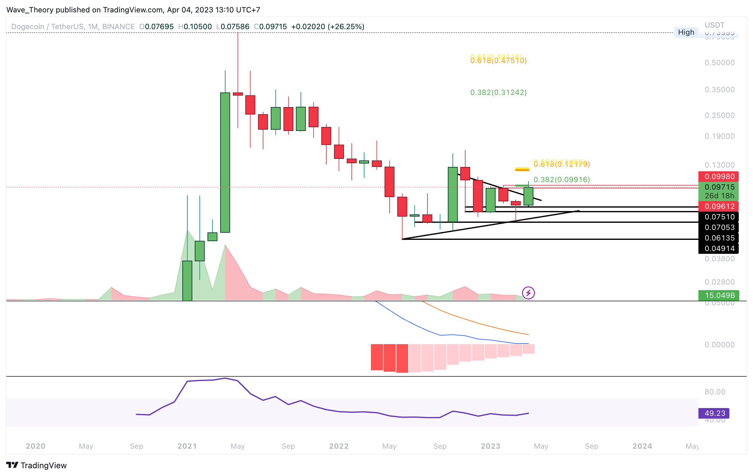 Im Monatschart tickt das Histogramm des MACDs seit vielen Monaten bullisch höher. Die MACD Linien sind dabei aber noch bärisch überkreuzt und der RSI gibt weder bullische noch bärische Signale. Nichtsdestoweniger sieht es extrem bullisch für den weiteren Kursverlauf von DOGE aus, wenn der Kurs die Golden Ratio bei rund 0,125 USD bricht.
