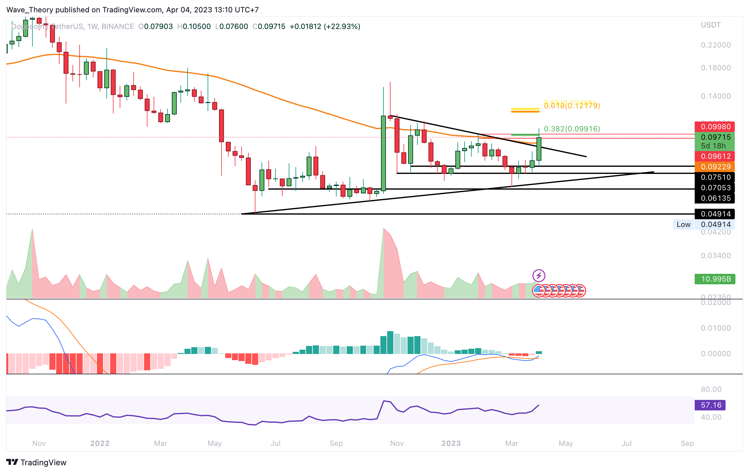Auch im Wochenchart tickt das Histogramm des MACDs bullisch höher und die MACD Linien überkreuzten sich bullisch, während sich der RSI in neutralem Territorium bewegt. Es scheint, als könnte Dogecoin in dieser Woche bullisch aus dem symmetrischen Dreieck ausbrechen, um bis zur Golden Ratio bei rund 0,125 USD zu steigen. Davor muss Dogecoin aber erst den 0,382 Fib Widerstand bei rund 0,1 USD brechen.