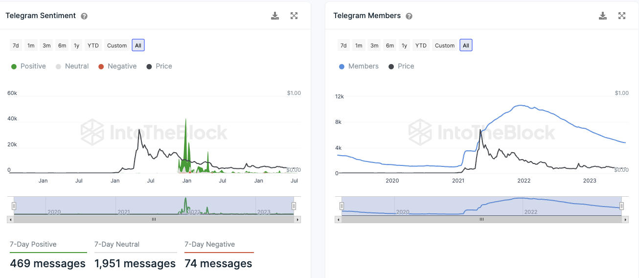 Die Stimmung auf Telegram bleibt überwiegend positiv, denn es stehen 469 positive Telegram Nachrichten 74 negative Nachrichten gegenüber. Die Anzahl an Telegram Mitgliedern der Dogecoin Gruppe nimmt jedoch stetig ab.