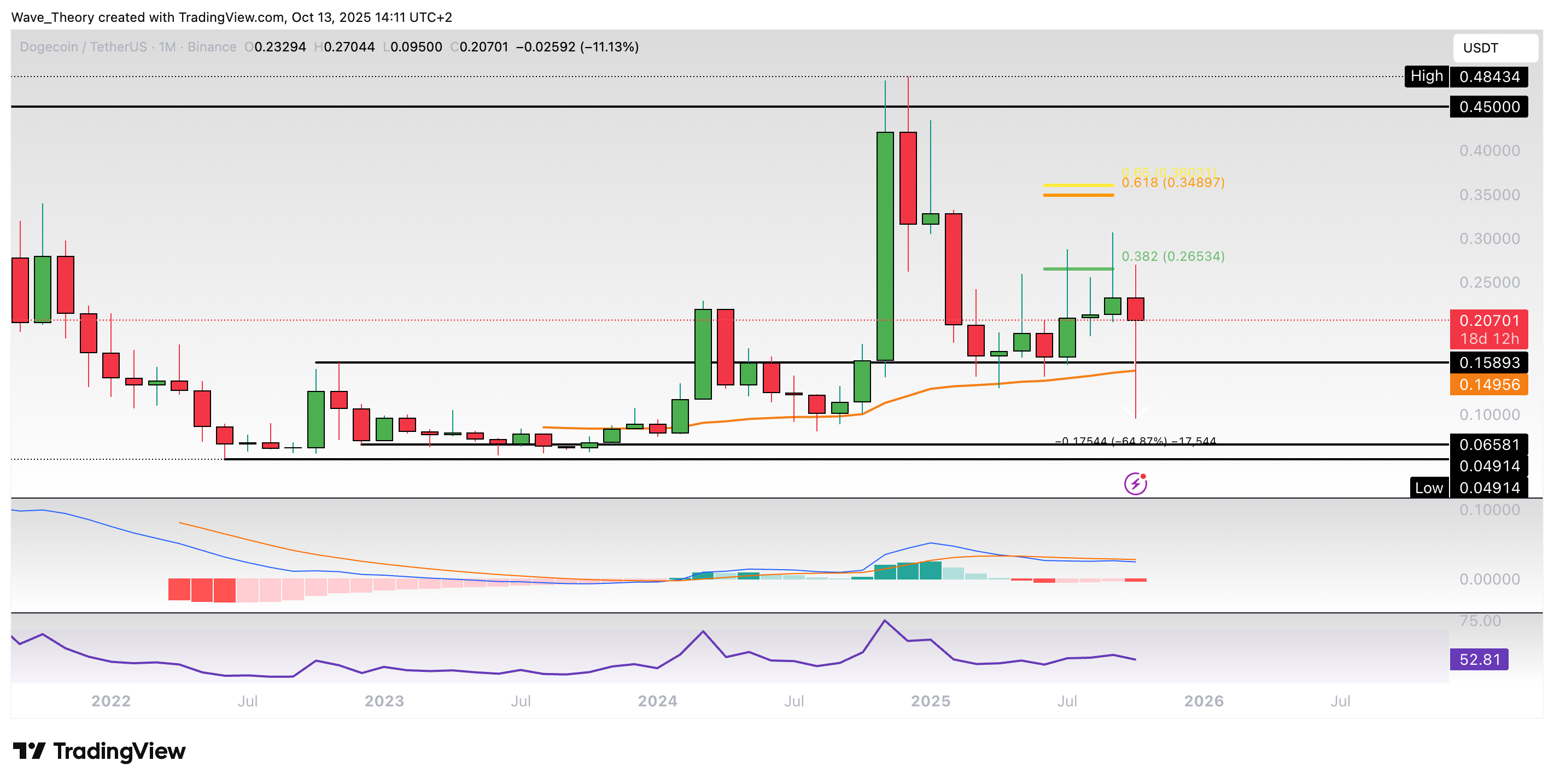 Im letzten halben Jahr hat sich der DOGE Kurs mühsam vom 50-Monate-EMA bei rund 0,15 USD zum 0,382 Fib Niveau bei rund 0,265 USD bewegt. Dabei konnte Dogecoin den 0,382 Fib Widerstand bei rund 0,265 USD aber nicht überwinden.