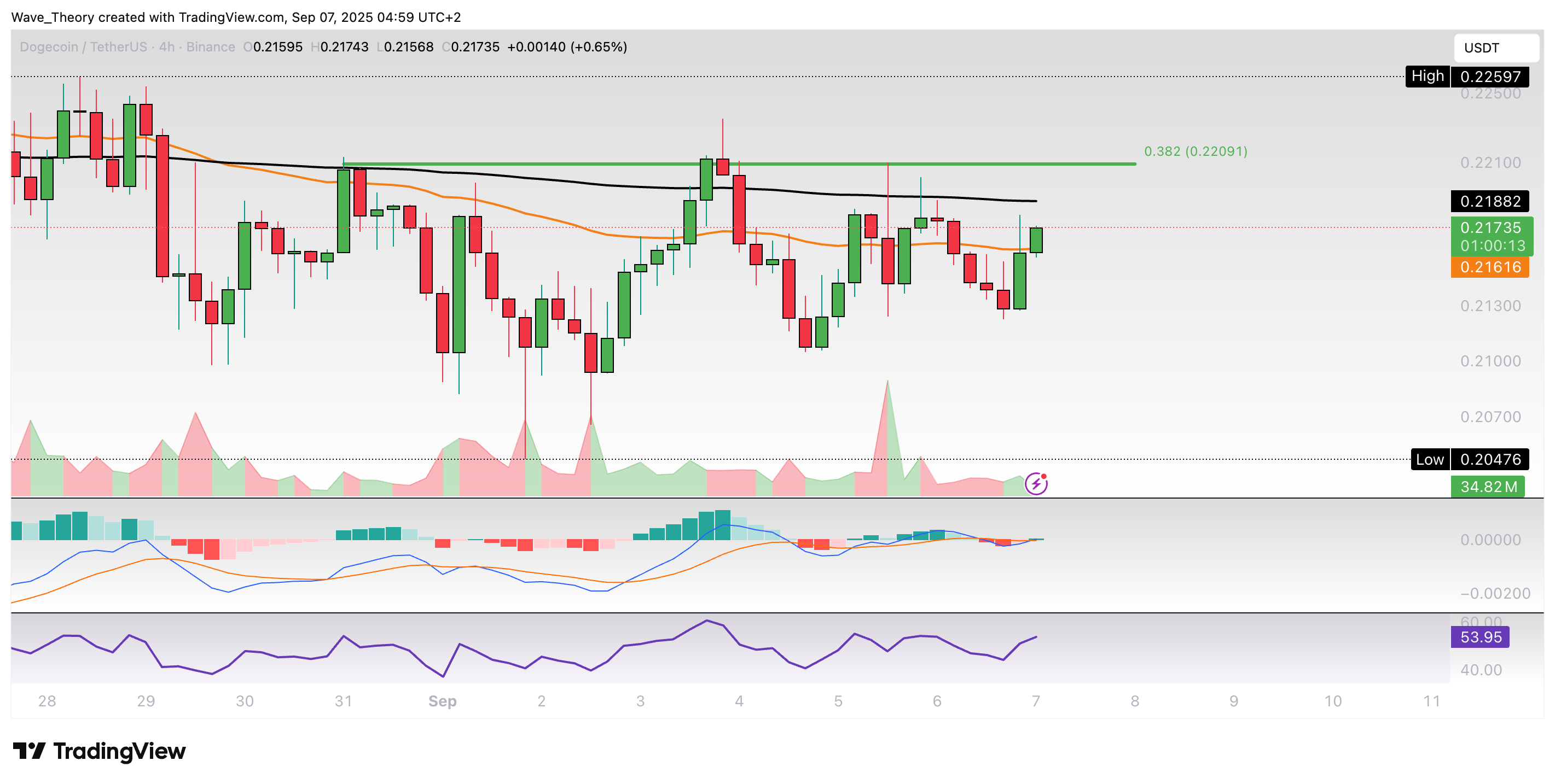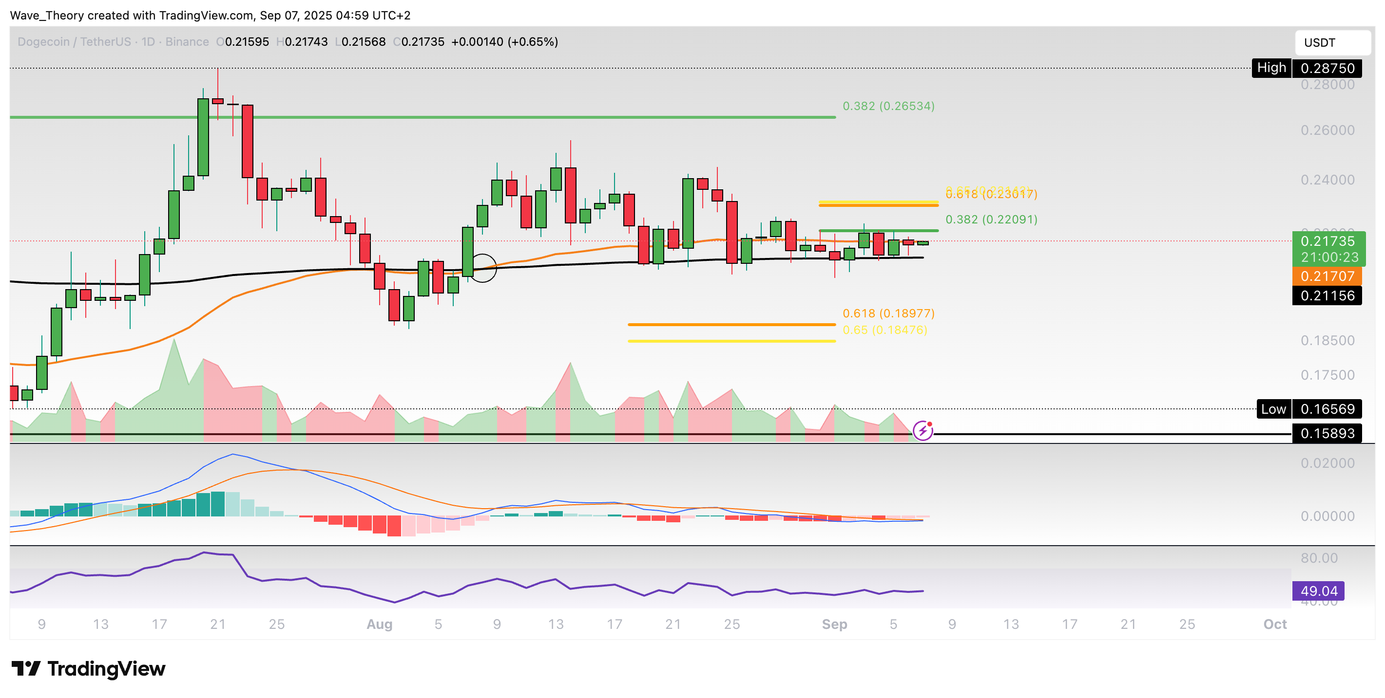 Dogecoin-Prognose für Sonntag, 07. September 2025: Der Dogecoin Kurs hält sich bisher erfolgreich an der 200-Tage-EMA Unterstützung.