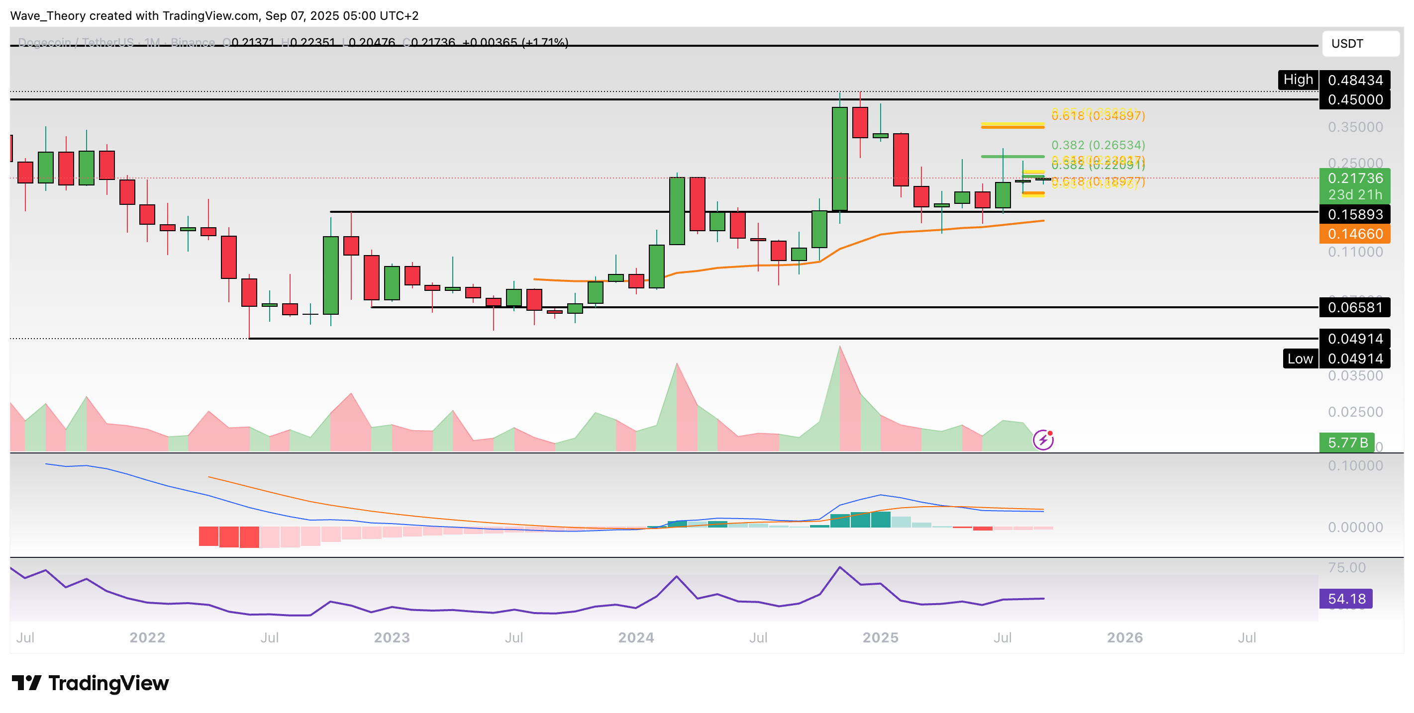Im Wochenchart wird ersichtlich, dass Dogecoin bei rund 0,208 USD auf signifikante Unterstützung am 50-Wochen-EMA stößt, welche die letzten sechs Wochen bisher erfolgreich halten konnte.