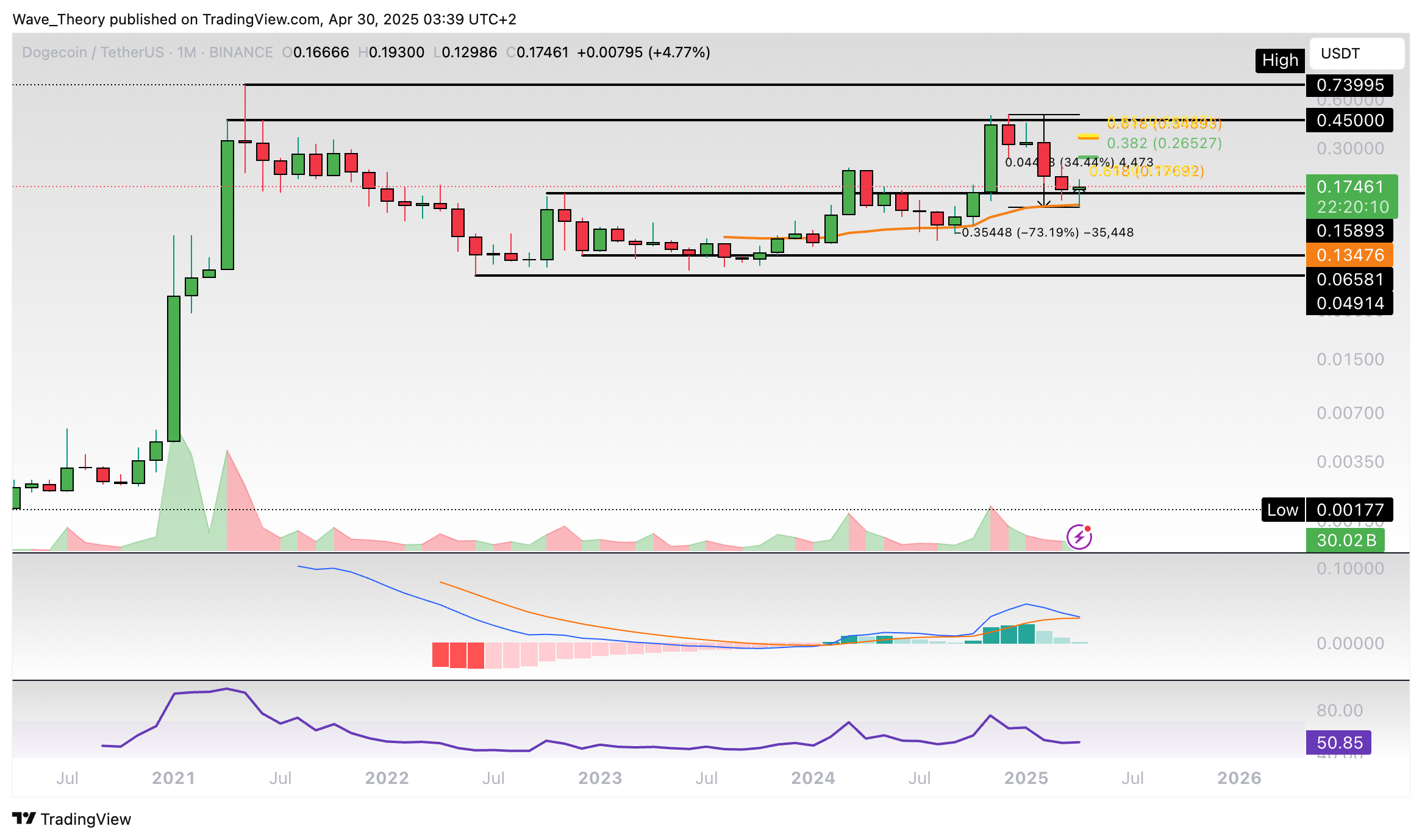 Nachdem der DOGE Kurs um rund 73 % gefallen ist, hat er die 50-Monate-EMA Unterstützung bei rund 0,135 USD erreicht, woran der Kurs bullisch abprallen konnte. Seither ist der Kurs wieder um rund 34,5 % gestiegen.