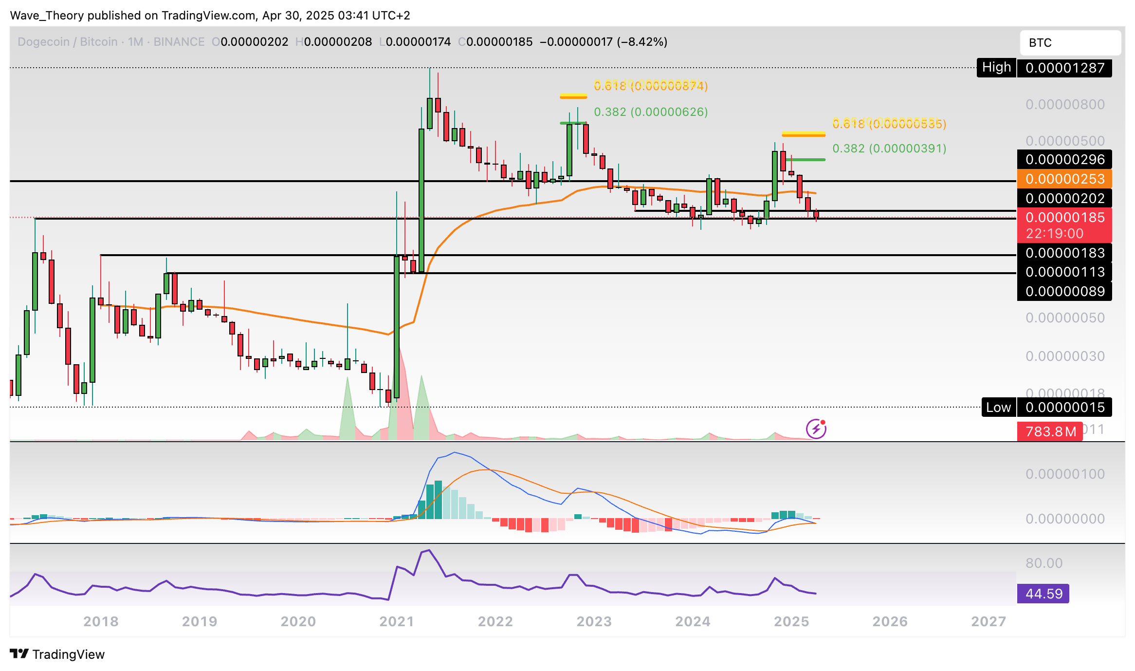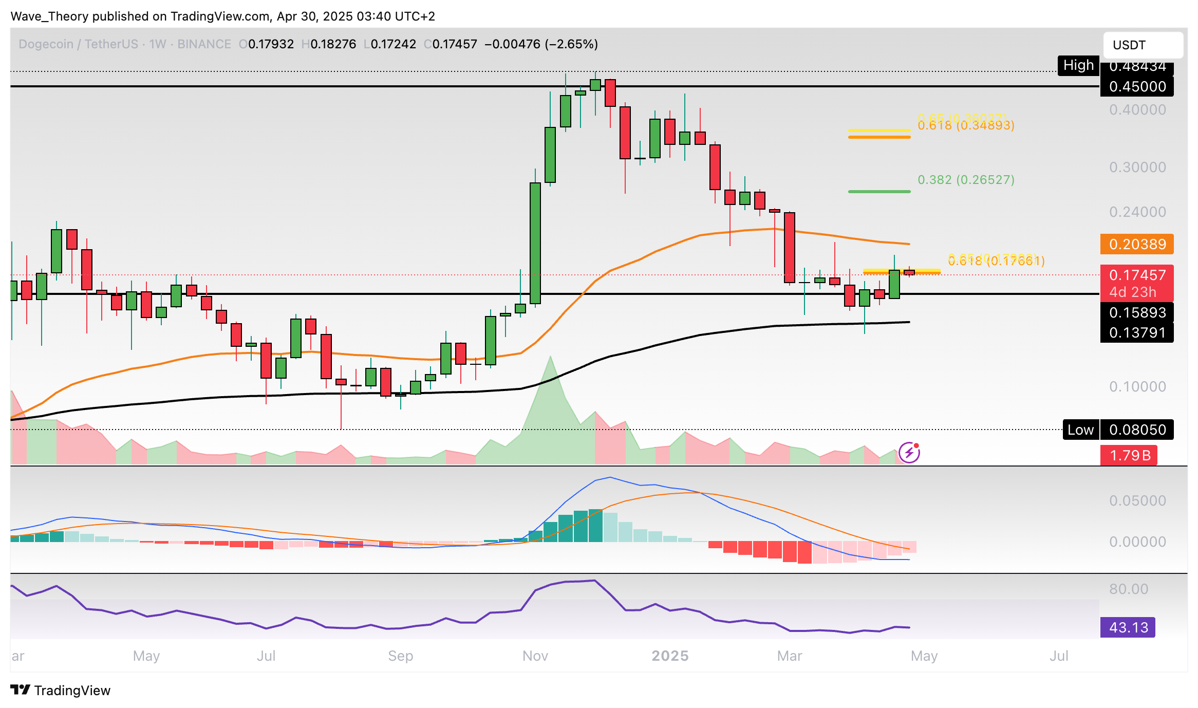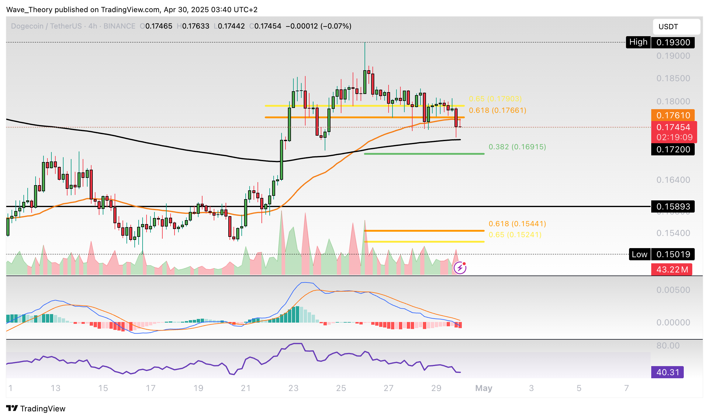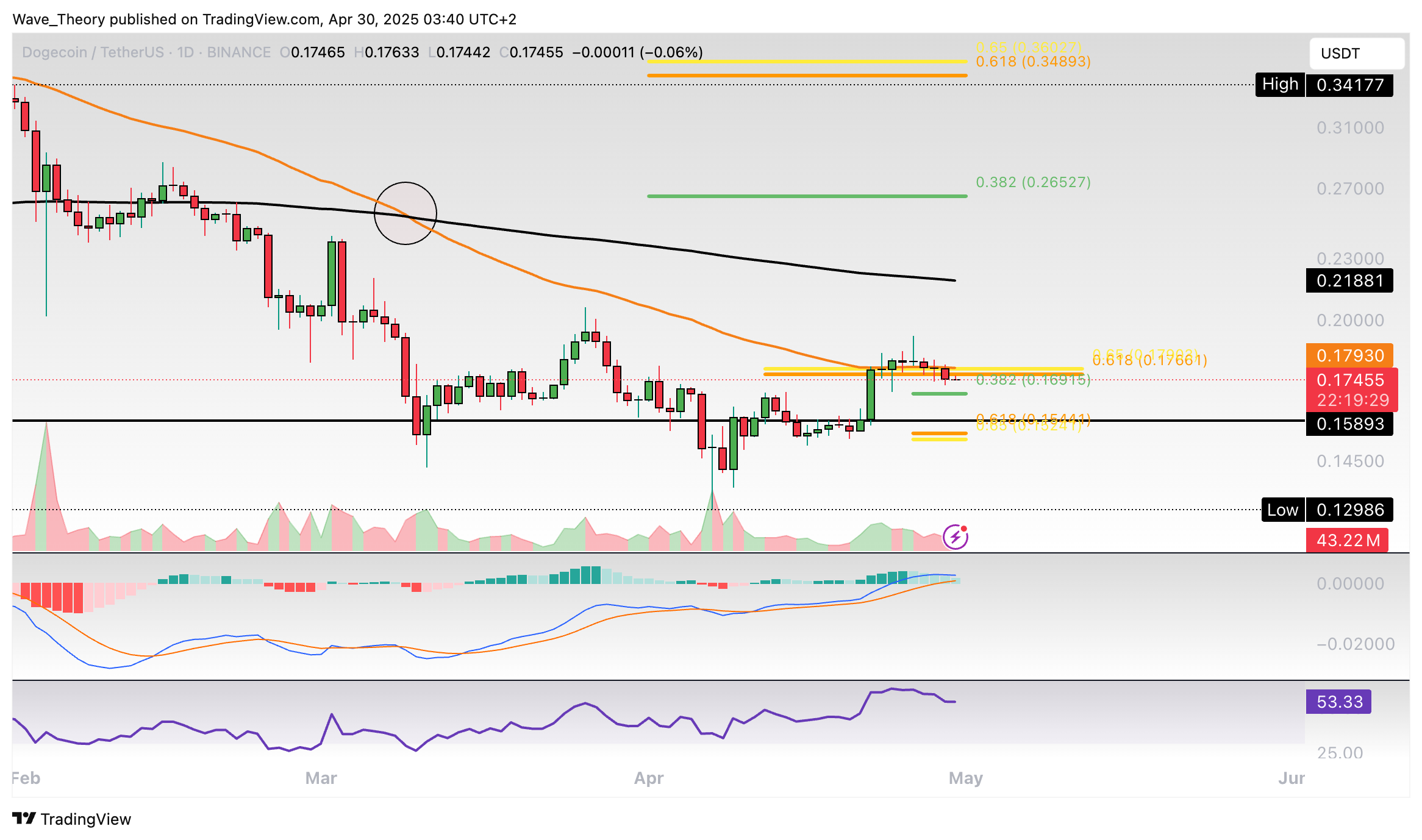 Insgesamt befindet sich Dogecoin in einer Korrekturbewegung. Erst mit dem Bruch der Golden Ratio bei rund 0,35 USD ist die Korrekturphase beendet.