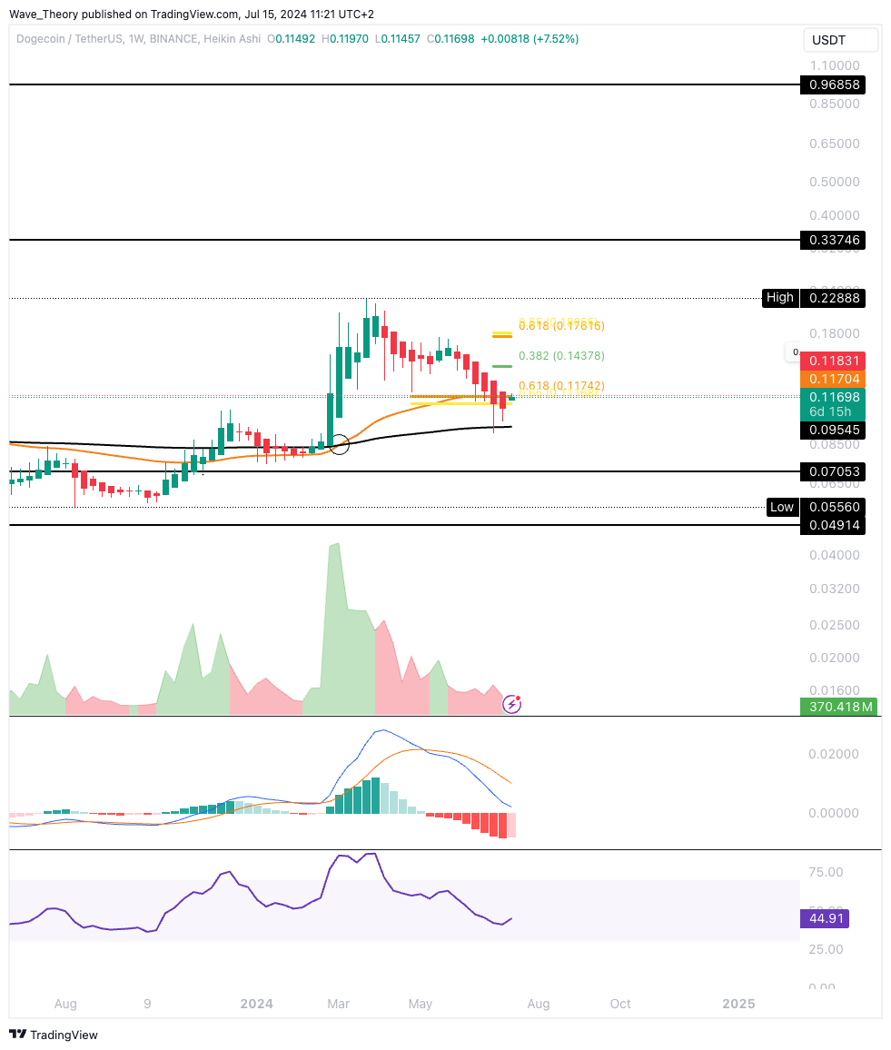Kurzfristig hatte Dogecoin die Golden Ratio Unterstützung bei rund 0,115 USD bärisch gebrochen, um den 200-Wochen-EMA bei rund 0,095 USD zu erreichen. Dort angekommen, konnte Dogecoin bullisch abprallen, womit sich der Kurs jetzt wieder an der Golden Ratio Unterstützung bei rund 0,115 USD befindet.