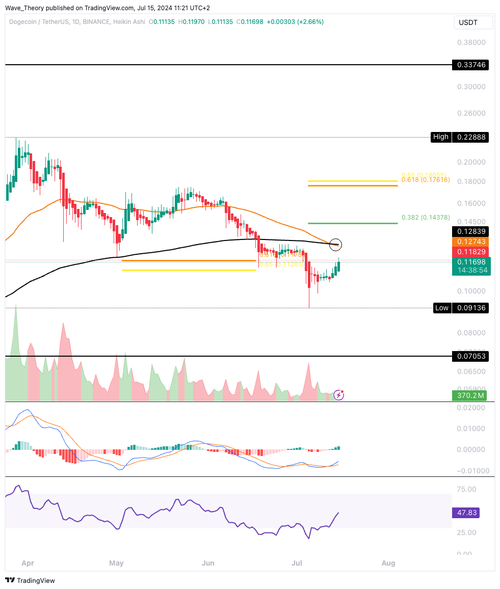 SponsoredTatsächlich ist die bullische Bewegung im Histogramm und das Erreichen der Golden Ratio Unterstützung bei rund 0,115 USD ein sehr bullisches Zeichen. Damit könnte Dogecoin jetzt den 0,382 Fib Widerstand bei rund 0,144 USD ins Visier nehmen.