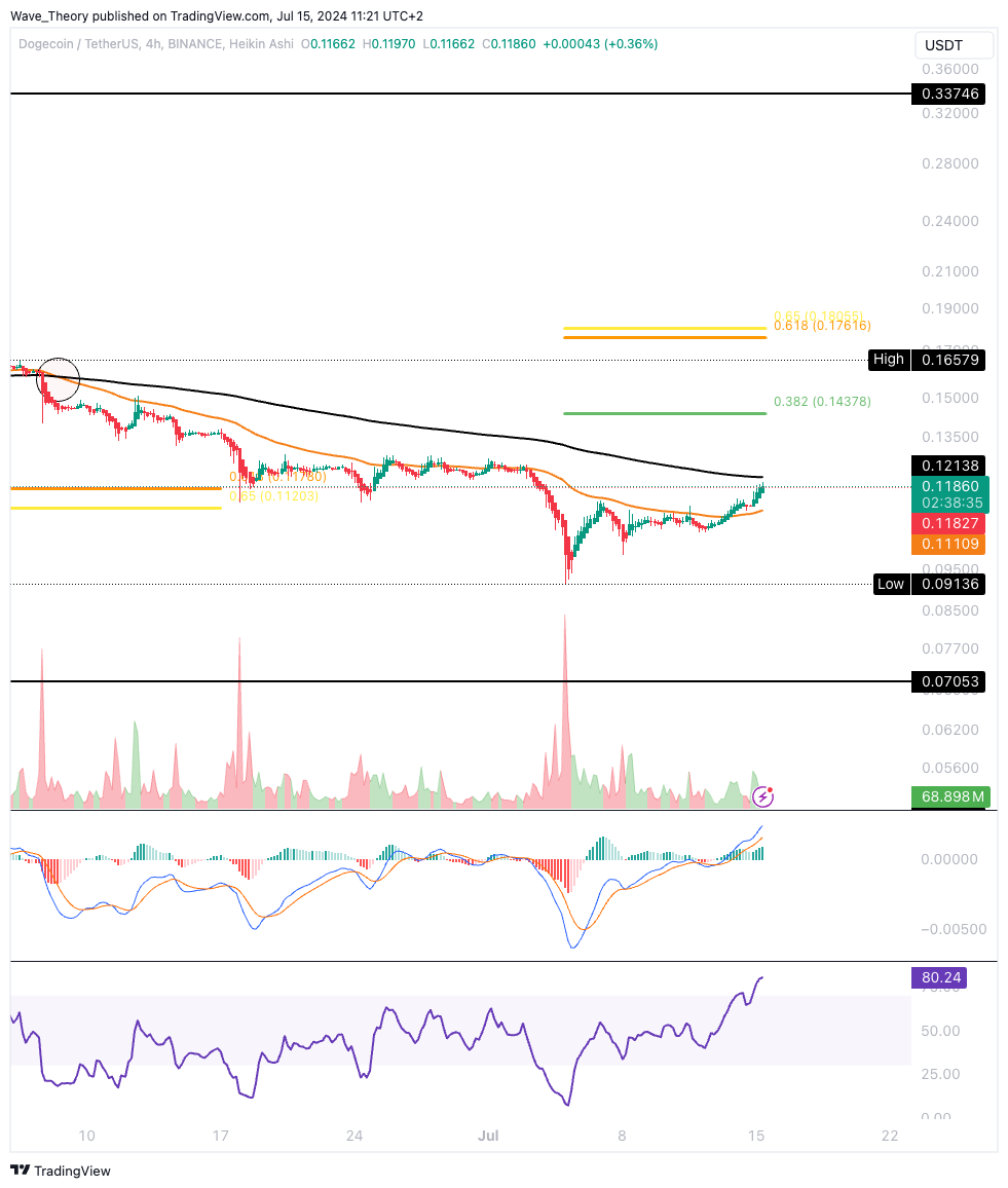 Zudem haben sich die MACD Linien bullisch überkreuzt. Kurzfristig sieht es nach einer Aufwärtsbewegung für den DOGE Kurs aus.