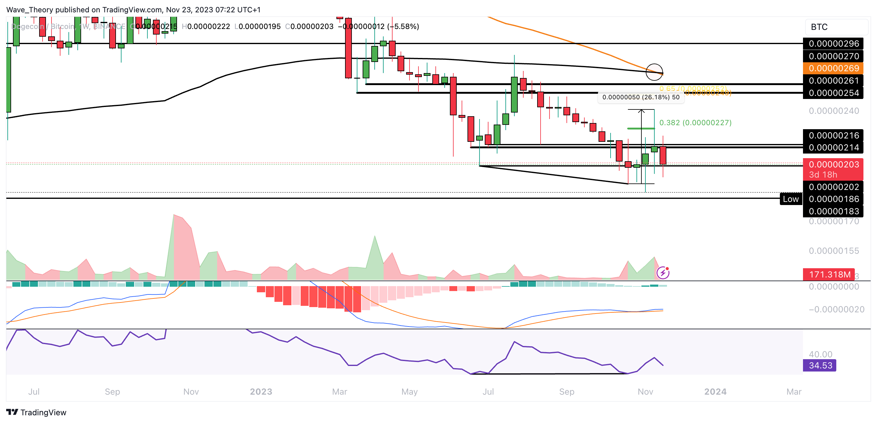 Damit könnte der Kurs jetzt noch höher steigen, um den Golden Ratio Widerstand bei rund 0,0814 USD zu erreichen. Ohne den Bruch dieses Widerstands bleibt die Korrekturbewegung intakt.