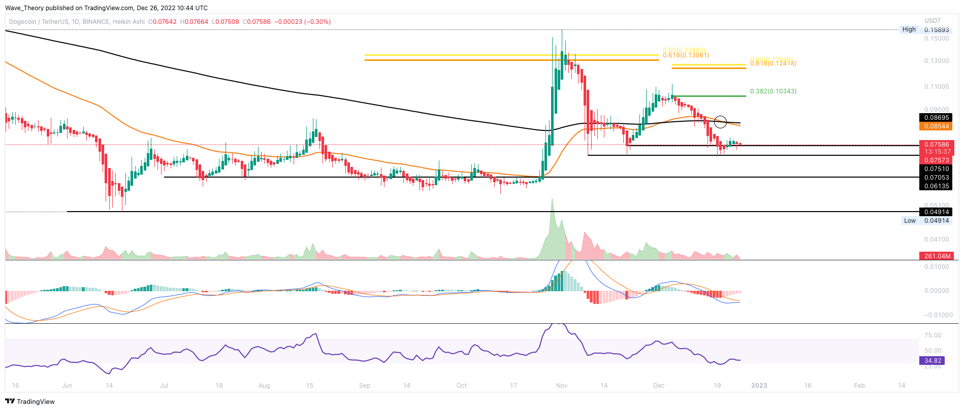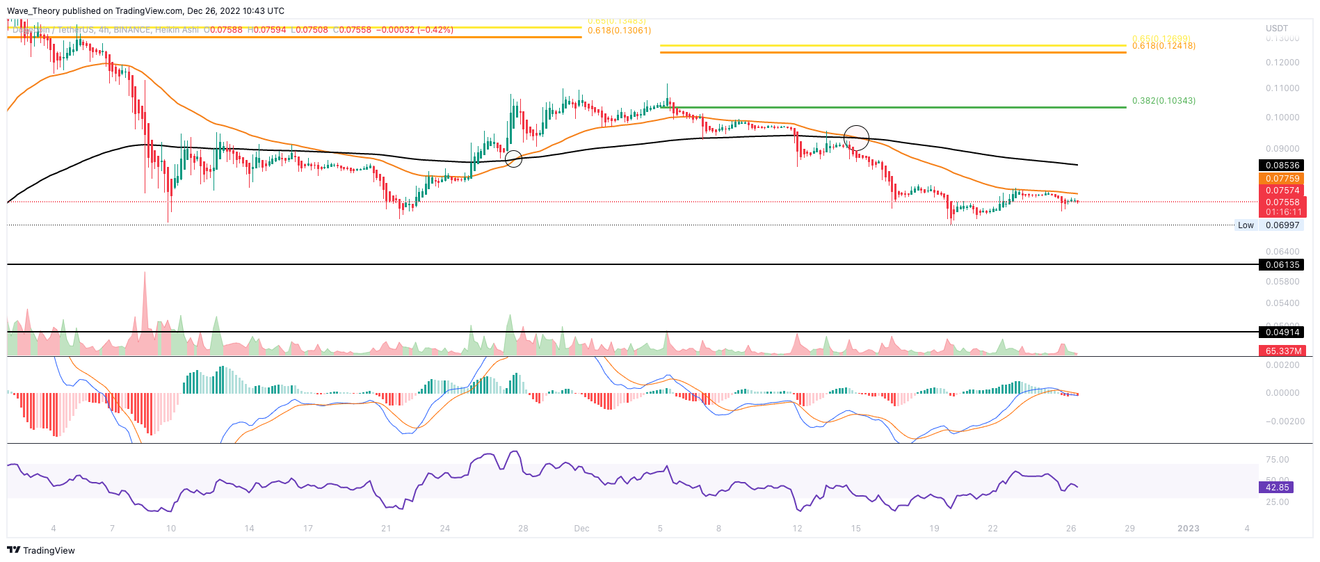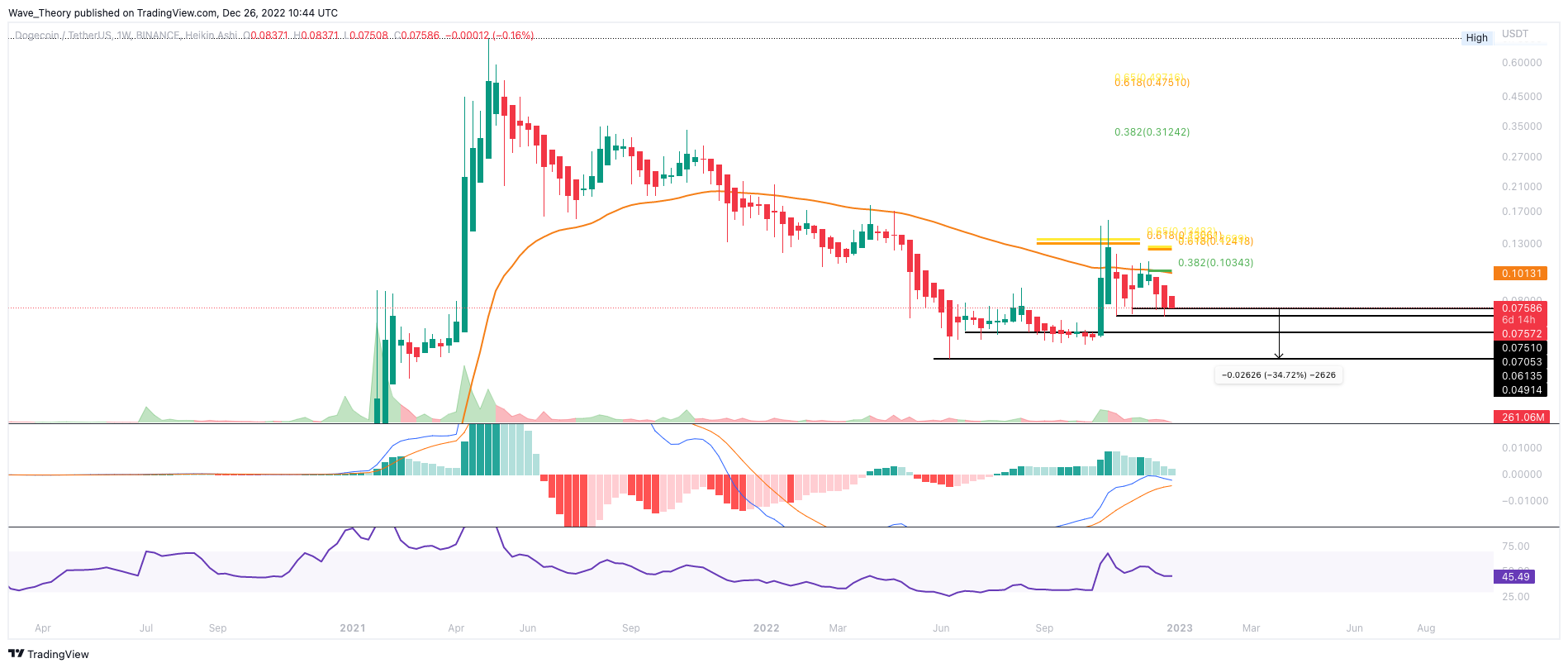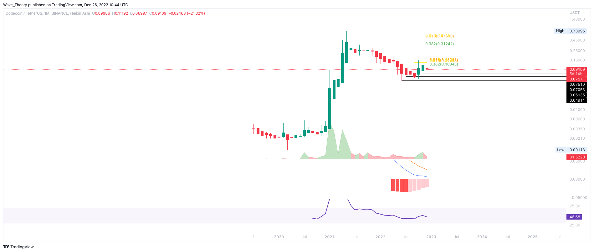 Das Histogramm des MACDs tickt im Monatschart immer noch bullisch höher, was Hinweise auf eine Bodenformation gibt. Tatsächlich besteht immer noch die Chance, dass der DOGE Preis bei rund 0,049 USD den Boden in diesem Bärenzyklus gefunden hat. Trotzdem könnte DOGE bald erneut zur Unterstützung zwischen rund 0,049 USD und 0,06135 USD zurückkehren.