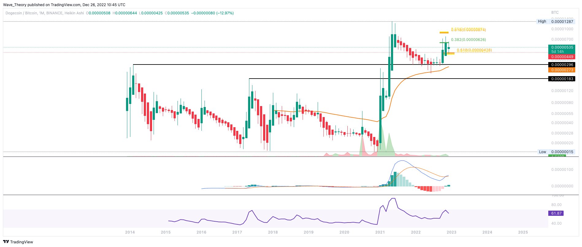 Gegen BTC wurde Dogecoin letzten Monat am 0,382 Fib Niveau bei rund 0,00000626 BTC bärisch abgewiesen. Auch in diesem Monat konnte DOGE diesen Widerstand nicht brechen.