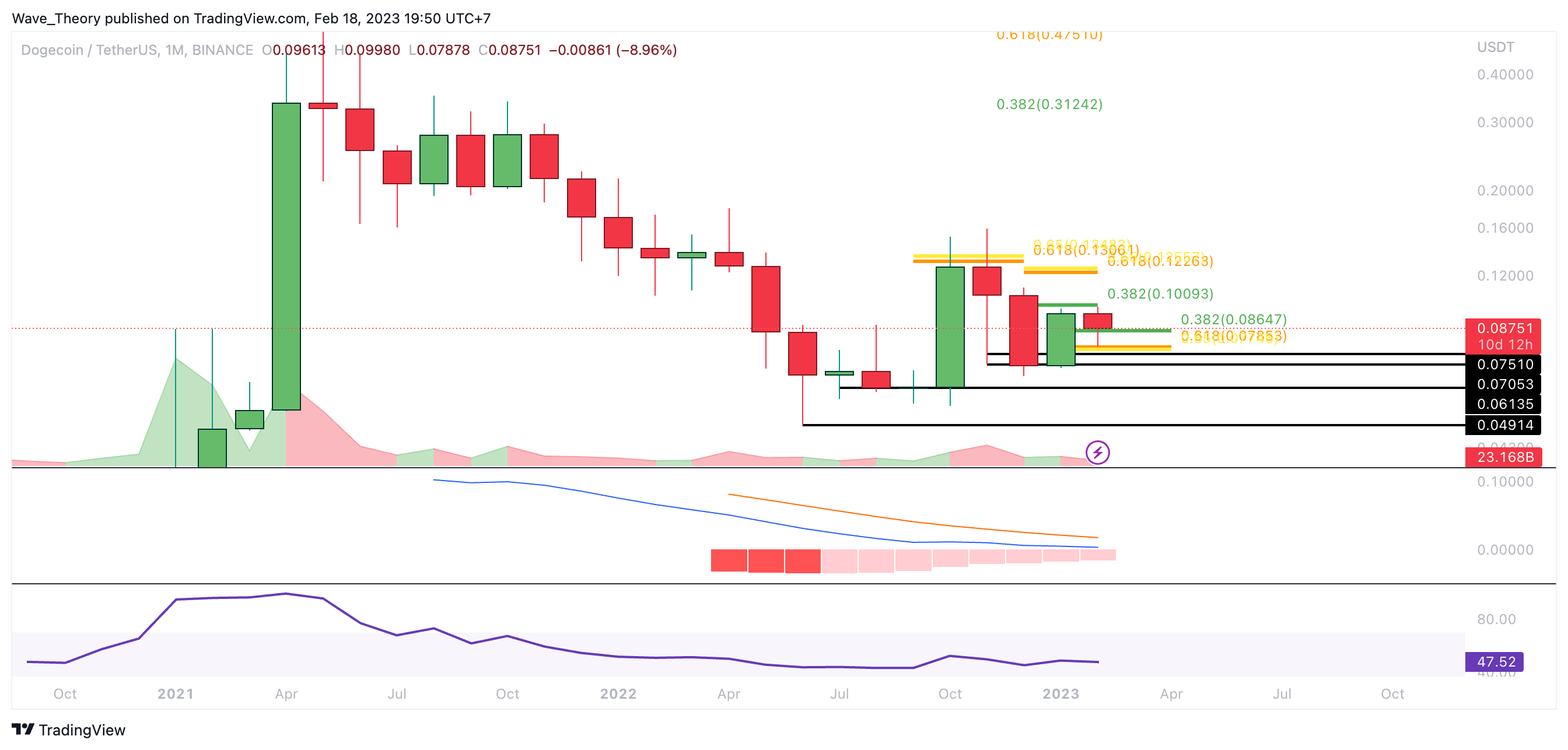 In der letzten DOGE Kurs Prognose, welche bereits vier Wochen zurückliegt, schrieben wir: “Dogecoin konnte an der horizontalen Unterstützung zwischen rund 0,0705 USD und rund 0,075 USD abprallen. Darüber hinaus tickt das Histogramm des MACDs seit einigen Monaten im Monatschart bullisch höher. Die MACD Linien sind dabei aber noch bärisch überkreuzt und der RSI zeigt sich neutral.
