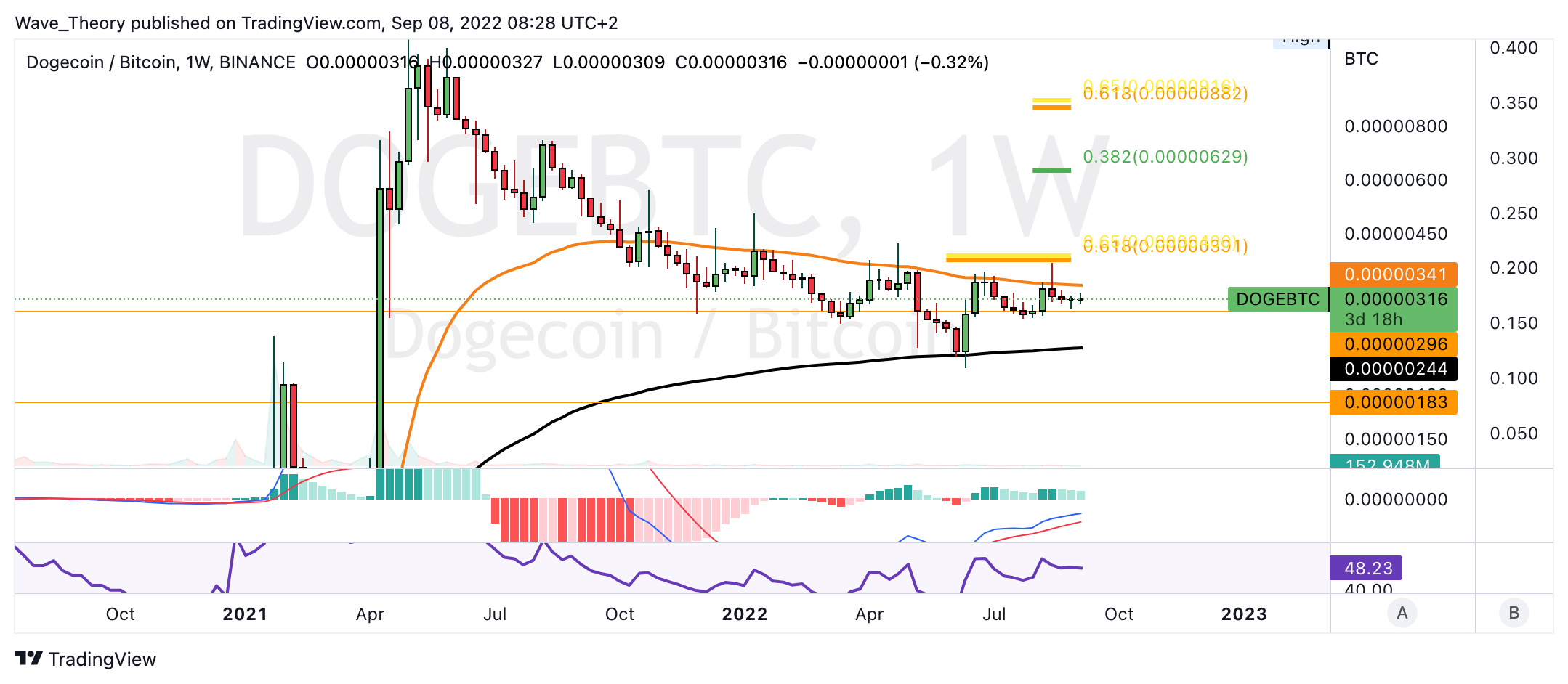 Aktuell stößt Dogecoin auf horizontale Unterstützung bei rund 0,000003 BTC.