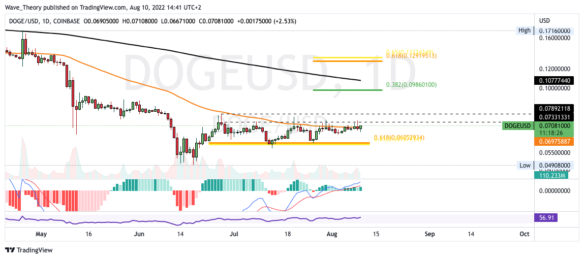Seit Wochen bewegt sich der DOGE Kurs zwischen 50-Tage-EMA Widerstand bei rund 0,07 USD und der Golden Ratio Unterstützung bei rund 0,06 USD. Am 50-Tage-EMA wurde der Dogecoin Kurs mehrfach abgewiesen und an der Golden Ratio Unterstützung konnte er bisher zweimal abprallen. Nun befindet sich der Dogecoin Kurs erneut am 50-Tage-EMA und sollte Dogecoin den Preisbereich zwischen 0,07 und 0,079 USD bullisch brechen, wartet bei rund 0,098 USD der nächste signifikante Fibonacci Widerstand auf DOGE.
