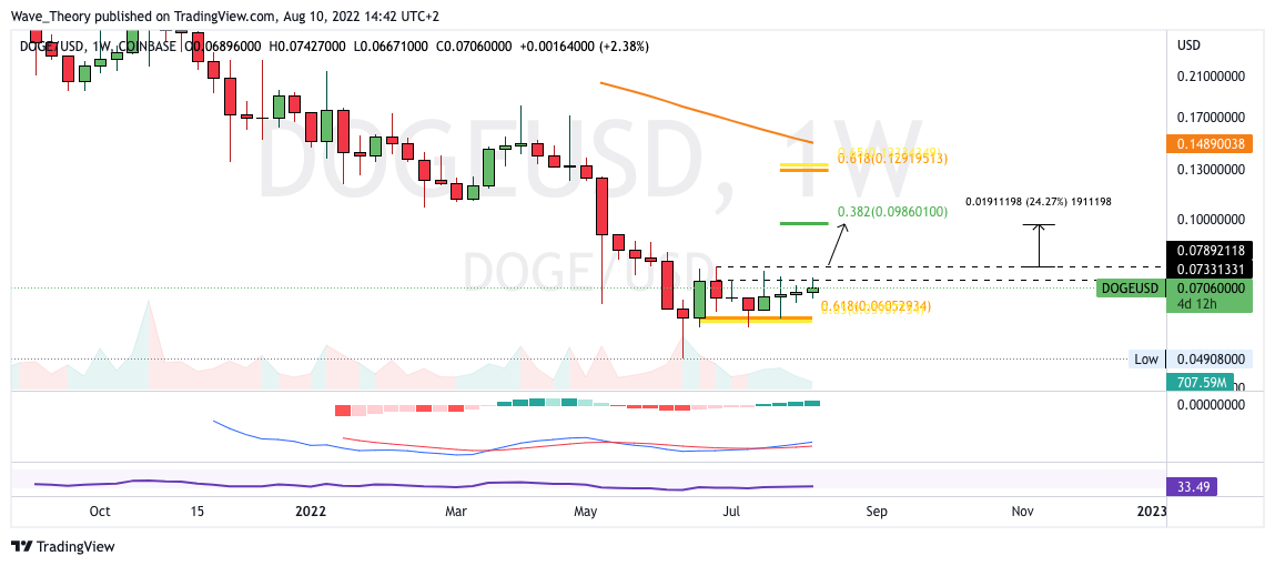 Zudem zeigt sich der MACD im Wochenchart eindeutig bullisch, denn das Histogramm tickt seit einigen Wochen bullisch höher und auch die MACD Linien sind bullisch überkreuzt. Tatsächlich könnte der Dogecoin Kurs bei rund 0,05 USD bereits seinen Boden gefunden haben, denn kurz-bis mittelfristig sieht es bullisch für den Dogecoin Kurs aus.