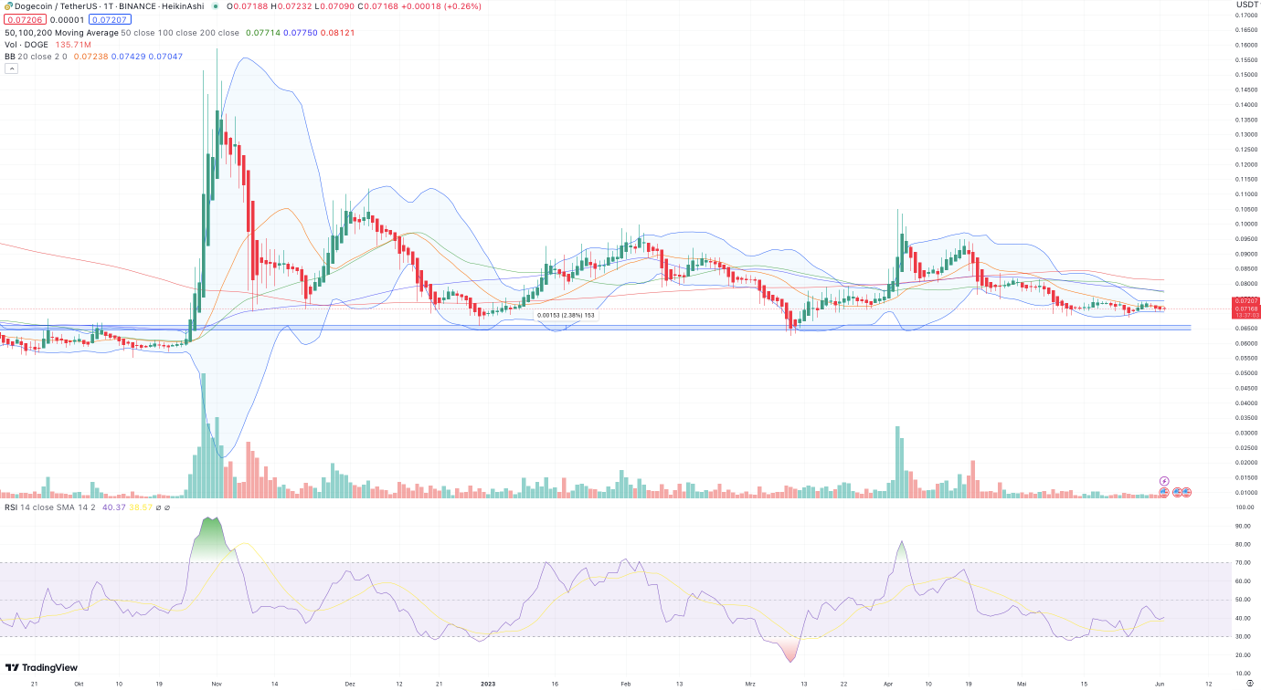 Das typische Chartbild von Kryptowährungen im Jahr 2023 sucht man beim Dogecoin vergeblich. Denn trotz zuletzt auch deutlicher Korrekturbewegungen summieren sich die Kursgewinne von BTC oder ETH auf mehr als 50 %. Der Dogecoin Kurs fällt im vergangenen Monat um 8 %, läuft in 2023 jedoch überwiegend seitwärts. Der RSI tendiert neutral. Zugleich bewegt sich der Dogecoin Kurs oberhalb des Supports bei rund 0,064-0,066 $. Allerdings mangelt es im Tageschart an Aufwärtsdynamik.