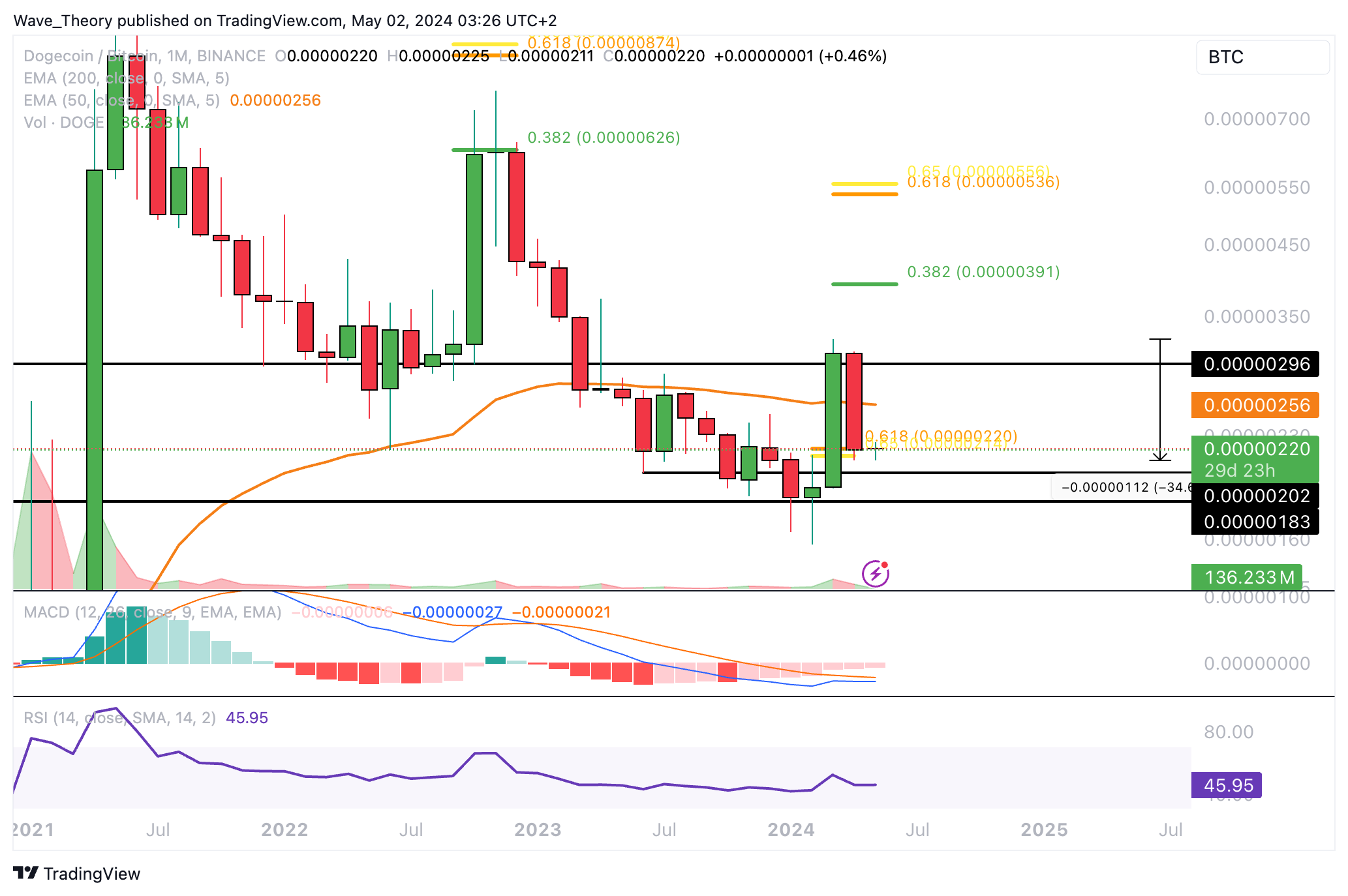 Gegen Bitcoin stößt Dogecoin jetzt bei rund 0,0000022 BTC auf signifikante Fib Unterstützung. Letzten Monat konnte Dogecoin bereits darüber schließen, womit in diesem Monat eine Aufwärtsbewegung folgen könnte.