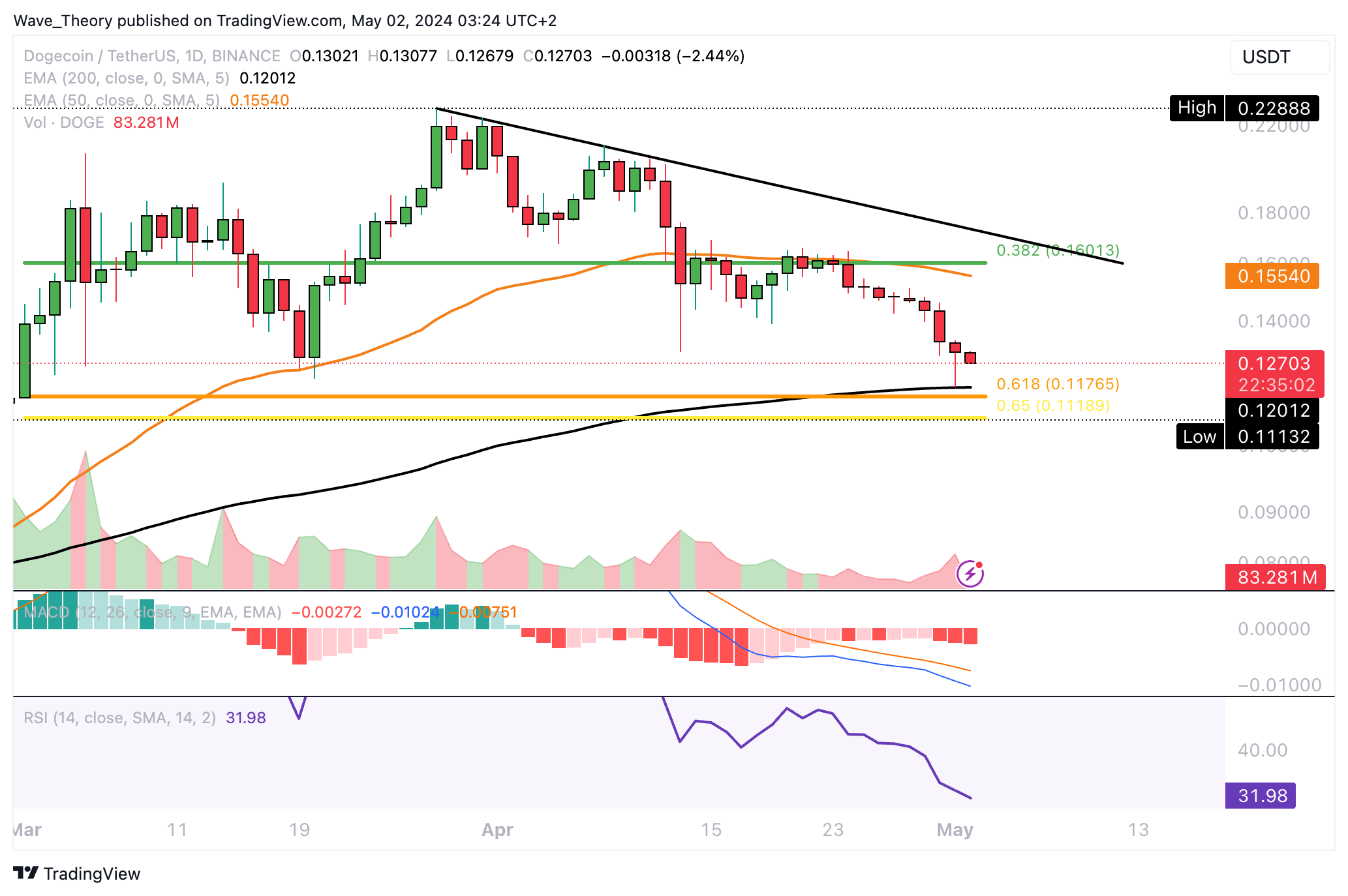 Gestern erreichte der DOGE Kurs signifikante Unterstützung am 200-Tage-EMA bei rund 0,12 USD, welche knapp über der Golden Ratio bei rund 0,115 USD liegt. Dort hat Dogecoin gute Chancen, bullisch abzuprallen.