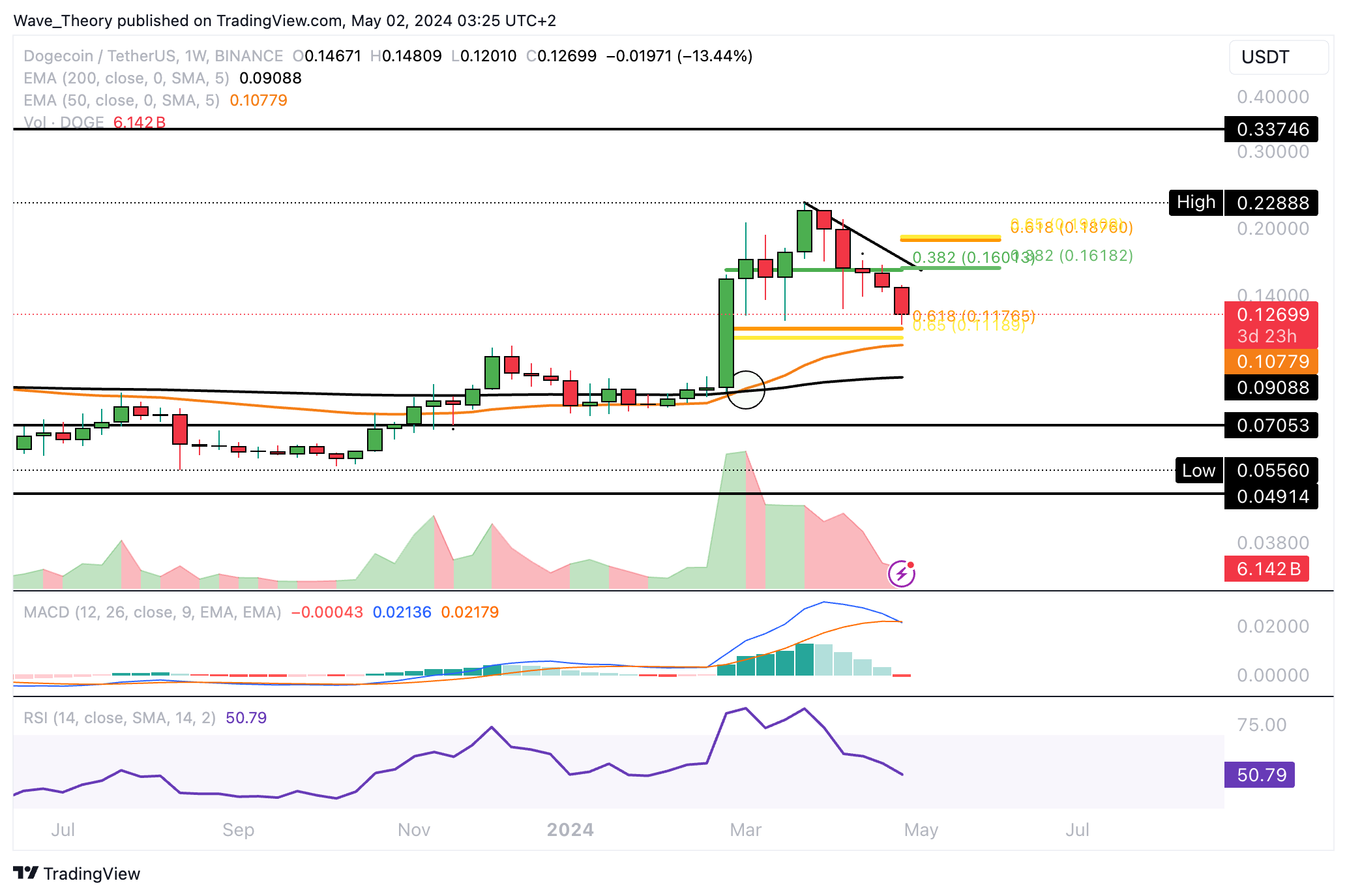 Erst mit dem Bruch der Golden Ratio bei rund 0,19 USD ist die Korrekturbewegung beendet. Dann könnte Dogecoin einen neuen Hochpunkt anstreben.