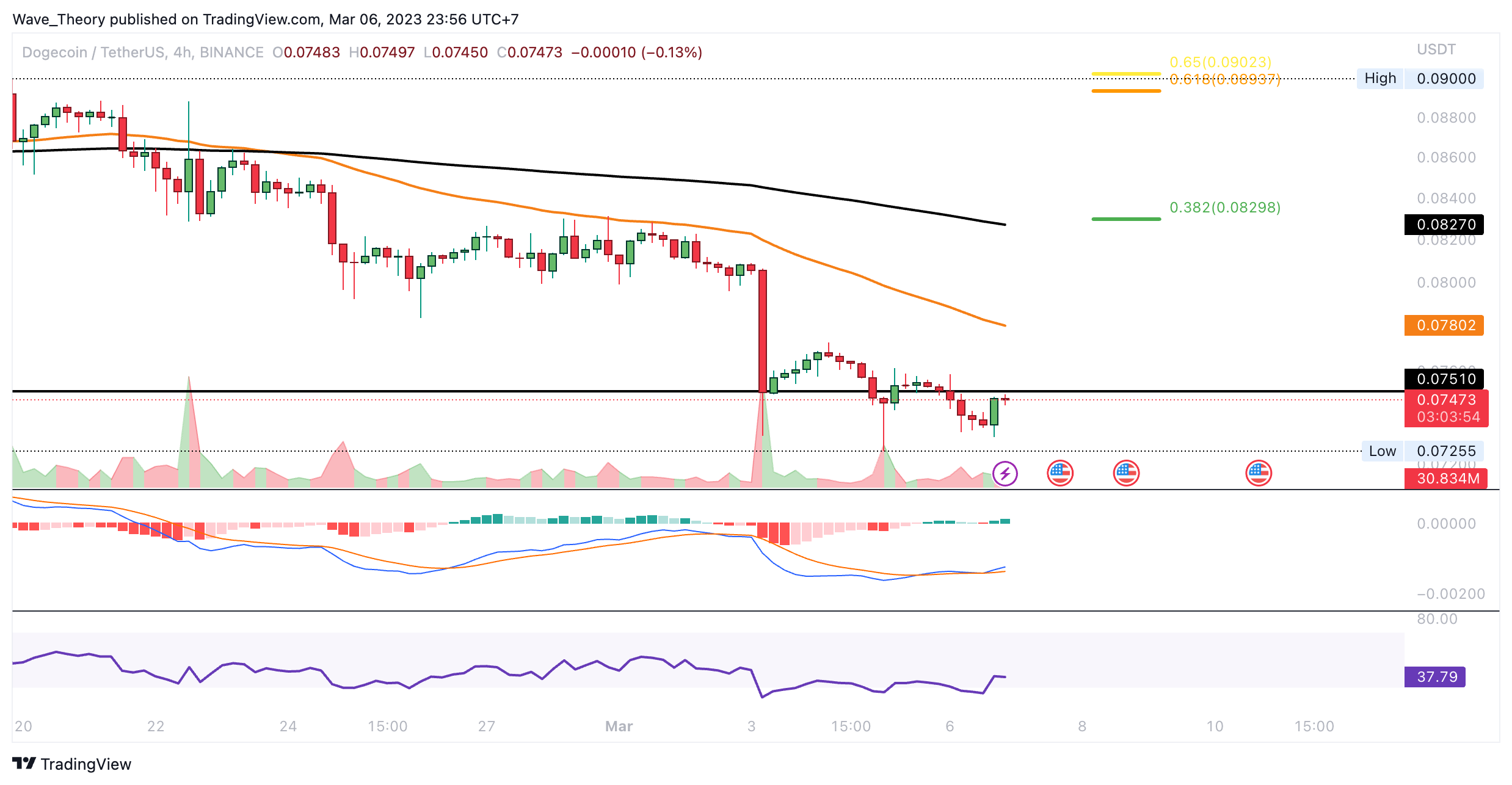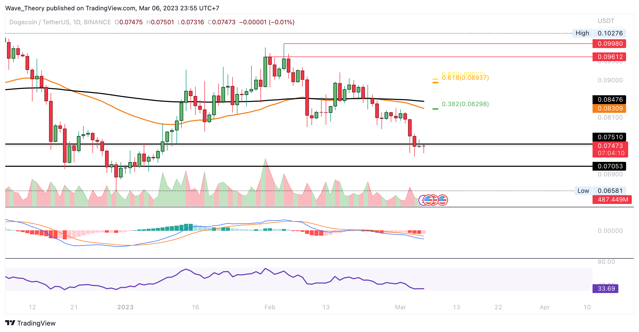 In der letzten DOGE Kurs Prognose, welche bereits drei Wochen zurückliegt, schrieben wir: “Zuvor konnte Dogecoin an der horizontalen Unterstützung zwischen rund 0,0705 USD und rund 0,075 USD abprallen, um exakt zum Kursziel des 0,382 Fib Widerstands bei rund 0,1 USD zu steigen. Dort angekommen, wurde der DOGE Kurs heftig abgewiesen, woraufhin DOGE zur Golden Ratio Unterstützung bei rund 0,078 USD korrigierte.