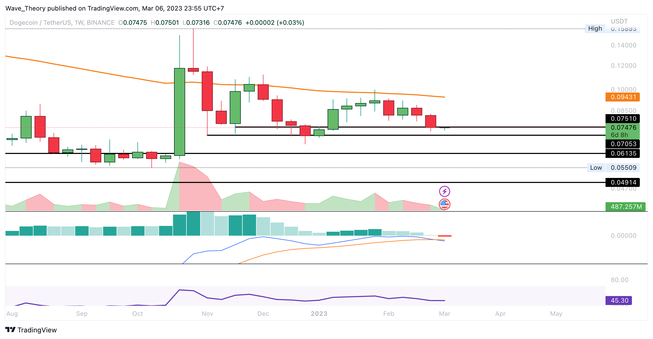 Das Histogramm des MACDs tickt im Monatschart jedoch noch immer bullisch höher. Die MACD Linien sind dabei aber bärisch überkreuzt und der RSI zeigt sich neutral. Sollte DOGE die aktuelle Unterstützung bärisch brechen, wartet spätestens zwischen rund 0,049 USD und rund 0,06135 USD die nächste signifikante Unterstützung auf den Dogecoin Kurs.