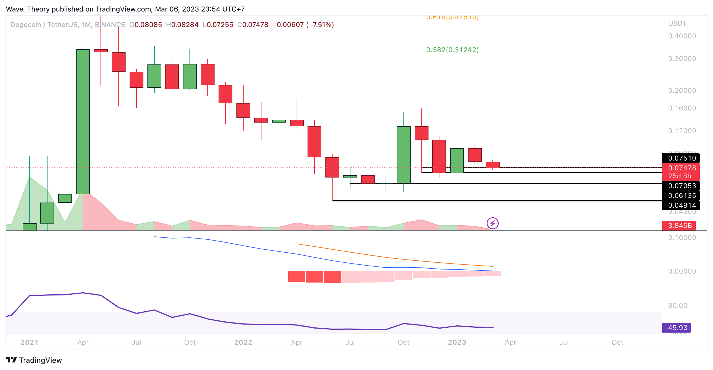 Der Dogecoin Kurs erreichte eine signifikante Unterstützungszone zwischen rund 0,07 USD und rund 0,075 USD, nachdem DOGE die Fibonacci Unterstützungen zuvor bärisch gebrochen hatte. Damit knüpft DOGE auch in diesem Monat an die Abwärtsbewegung vom letzten Monat an.