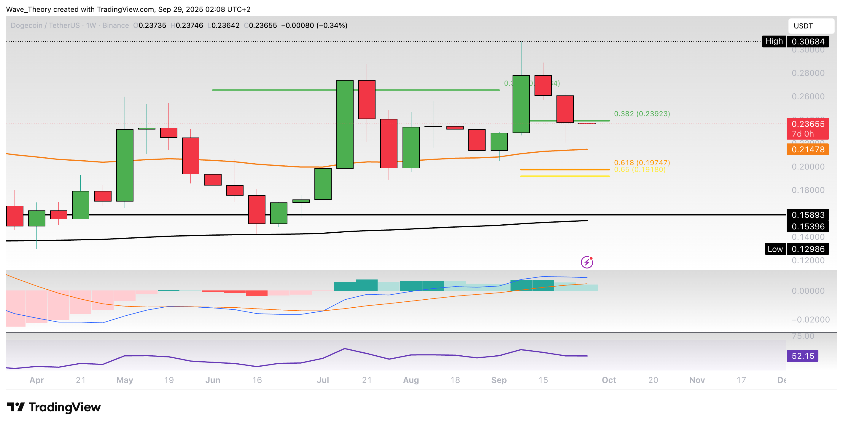 In den letzten zwei Wochen ging es steil bergab für den DOGE Kurs. Der Preis von Dogecoin ist dabei rund 24 % gefallen. Dabei konnte er letzte Woche aber am 0,382 Fib Niveau bei rund 0,239 USD schließen.