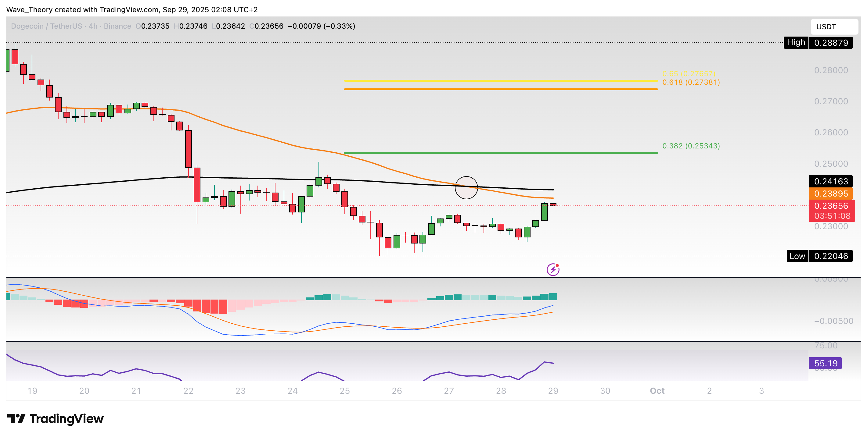 Dogecoin-Prognose für Montag, 29. September 2025: Der Dogecoin Kurs konnte sich über dem 200-Tage-EMA halten und hat eine Aufwärtsbewegung initiiert.