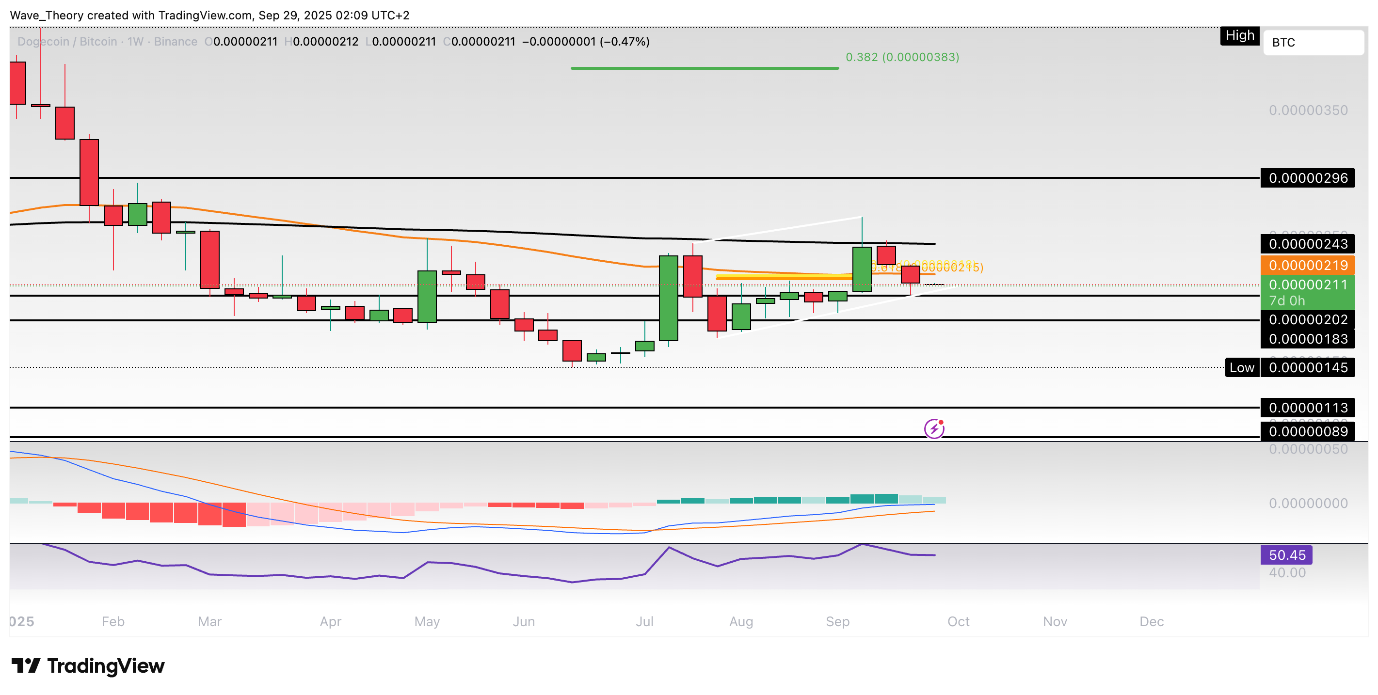 Gegen Bitcoin wurde Dogecoin letzte Woche am 200-Wochen-EMA bei rund 0,00000243 BTC bärisch abgewiesen. Damit ist jetzt zur Unterstützung zwischen rund 0,0000018 BTC und 0,000002 BTC zurückgekehrt.