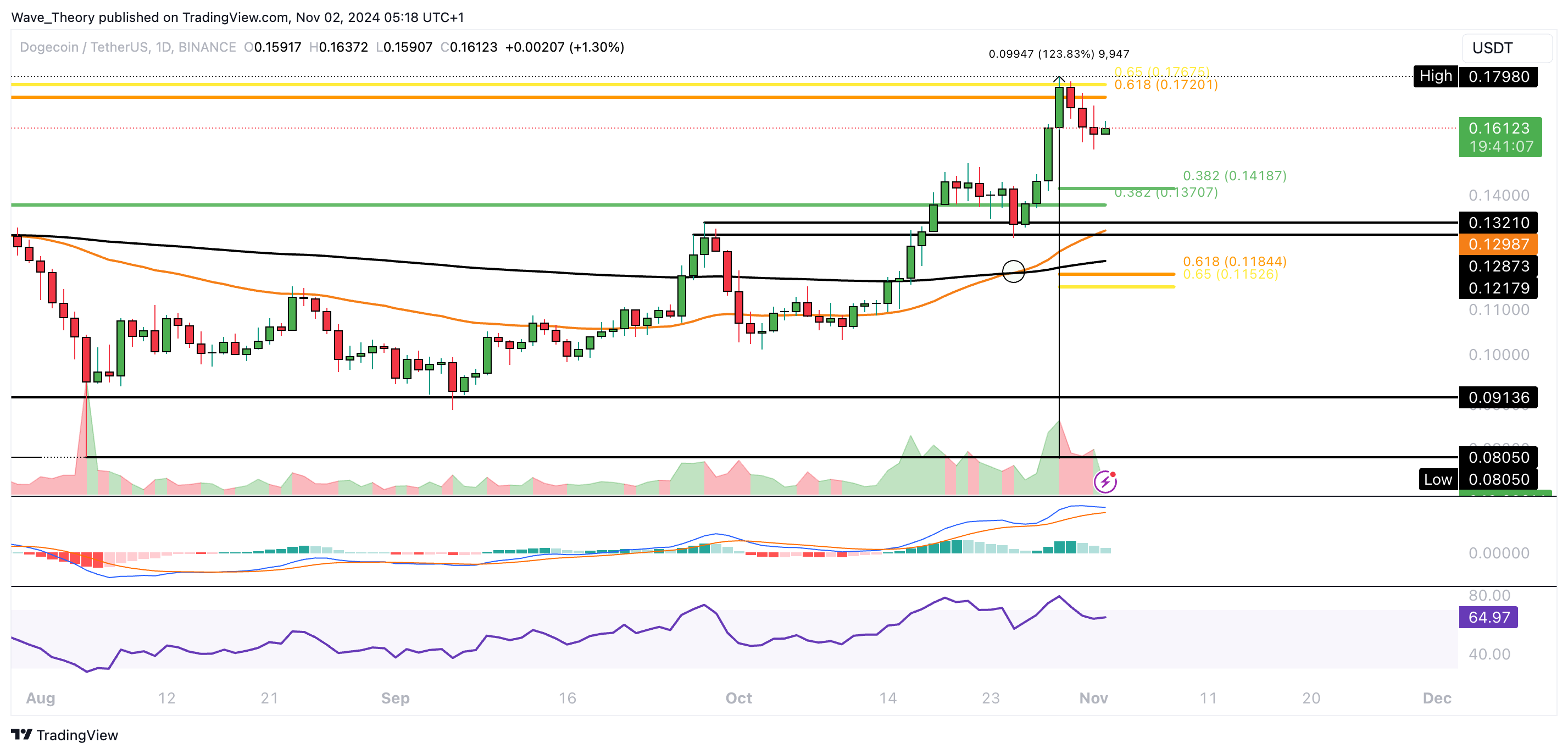 Der Dogecoin Kurs wurde am Golden Ratio Niveau bei rund 0,175 USD bärisch abgewiesen und hat eine Korrektur initiiert. Damit warten jetzt bei rund 0,142 USD und bei rund 0,118 USD die nächsten signifikanten Fibonacci Unterstützungen.