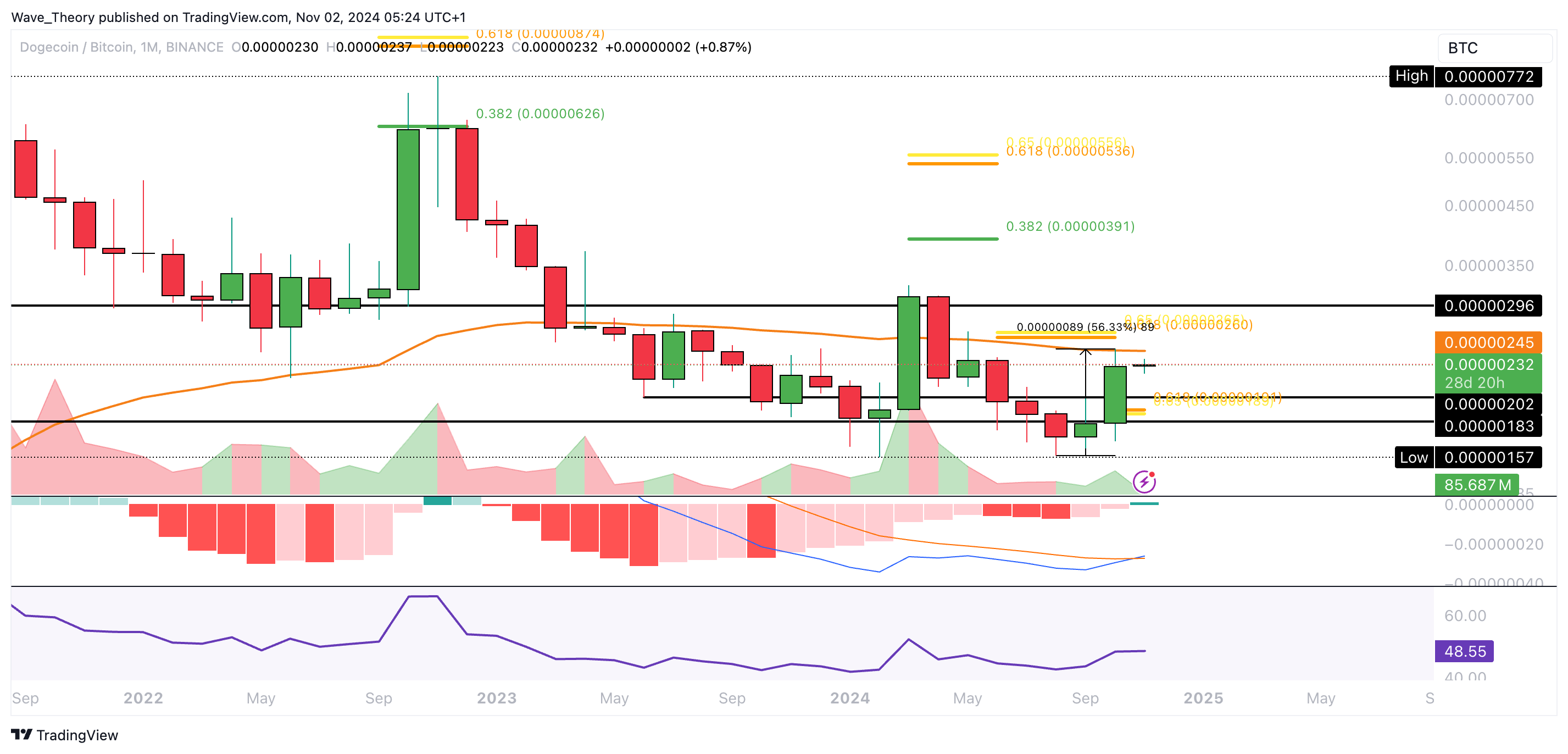 Gegen Bitcoin konnte Dogecoin die letzten zwei Monate rund 56 % steigen. Jedoch stieß Dogecoin letzten Monat am 50-Monate-EMA bei rund 0,000024 BTC auf signifikanten Widerstand.