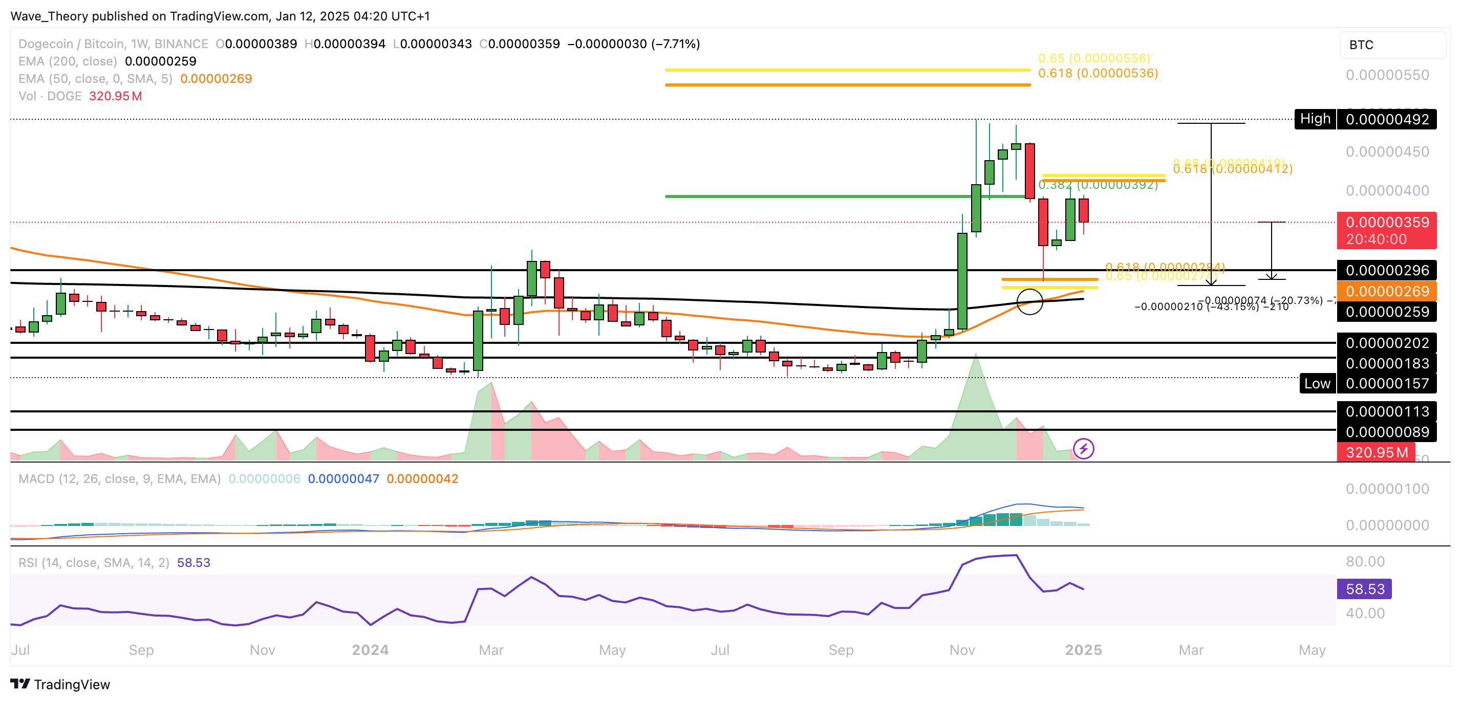 Gegen Bitcoin konnte der DOGE Kurs an der Golden Ratio Unterstützung bei rund 0,00000285 BTC bullisch abprallen, um in Zuge dessen rund 44 % zu steigen.