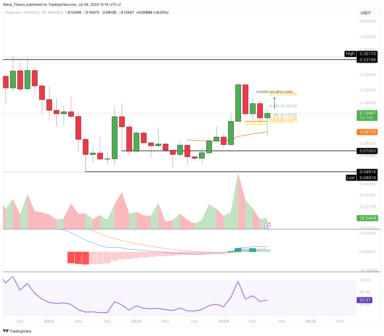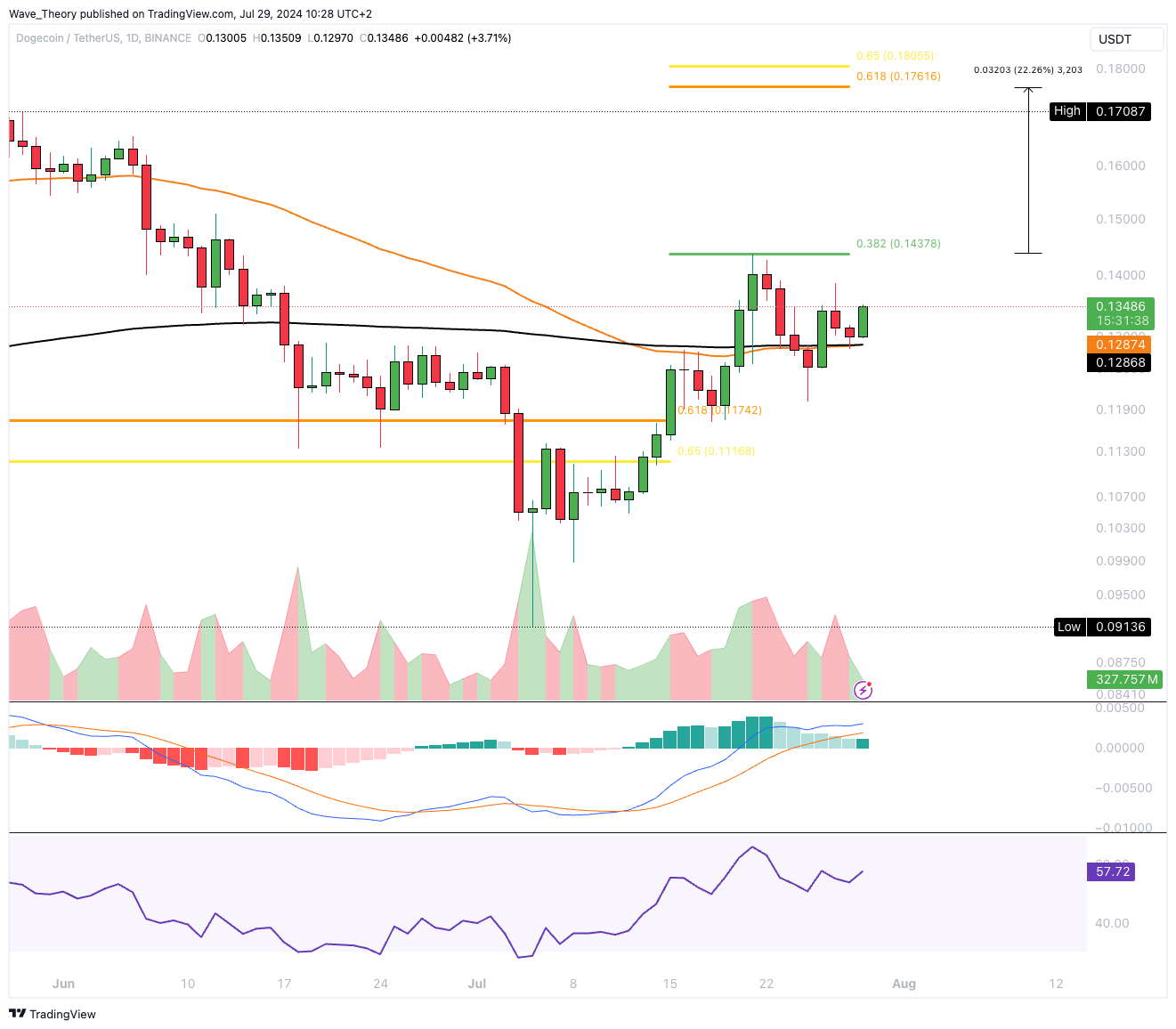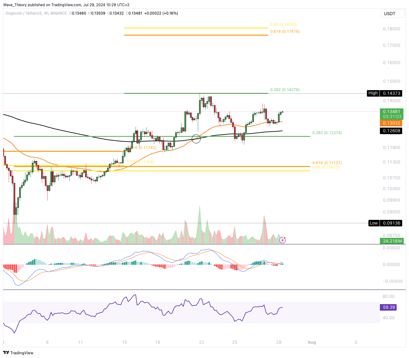 Damit könnte Dogecoin erneut zum 0,382 Fib Widerstand bei rund 0,144 USD steigen, woran der DOGE Kurs vor wenigen Tagen bärisch abgewiesen wurde. Mit einem bullischen Bruch könnte der DOGE Kurs um weitere 22,2 % steigen, um den Golden Ratio Widerstand bei rund 0,18 USD zu erreichen.