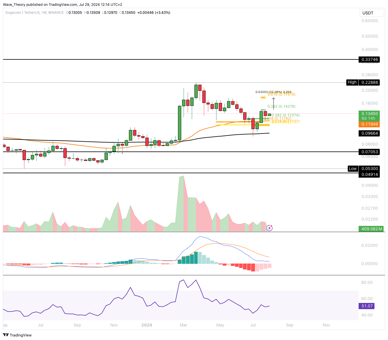Im Wochenchart von Dogecoin weist das Histogramm des MACDs einen Aufwärtstrend auf