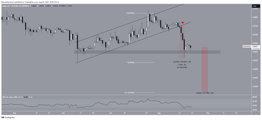 Nach mehreren erfolglosen Versuchen brach der Kurs dann im Juli 2023 über die zuvor erwähnte Widerstandslinie aus (grüner Kreis). Allerdings konnte DOGE die darauffolgende Aufwärtsbewegung nicht aufrechterhalten. Anstatt eine weitere Aufwärtsbewegung zu initiieren, fiel der Dogecoin Kurs in der letzten Woche erneut unter die Widerstandslinie und kehrte dann zum Unterstützungsbereich bei 0,06 US-Dollar zurück.