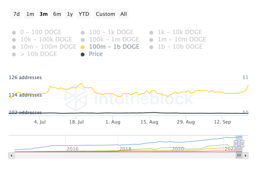 Die Anzahl der Adressen, die zwischen 100 Millionen und einer Milliarde DOGE halten, ist in den letzten sieben Tagen um 5,13 % gestiegen.