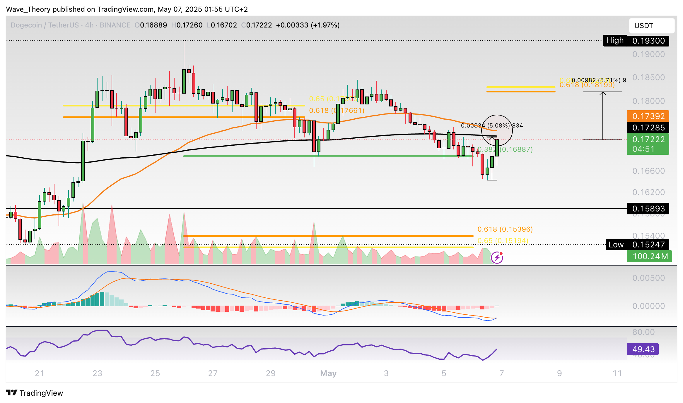 Sollte der DOGE Kurs noch höher steigen und das Golden Ratio Niveau bei rund 0,182 USD erreichen, impliziert das ein Aufwärtspotenzial von rund 5,7 %.